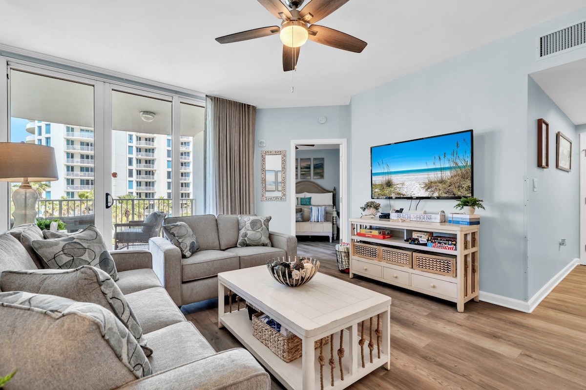 Master bedroom with bathroom, bunk room with bathroom (the bunk room has one bunk bed and no door), sofa sleeper. Balcony with lazy river and bay view. You will find everything here from Lazy River, seven pools (one heated, one with waterfall), hot tubs, zero entry pool, gym, bbq area. Next door is an arcade with virtual reality, bar and food. You have access to swim and play in both the ocean and the bay. It is a short walk to the Okaloosa boardwalk for shopping, restaurants and fun