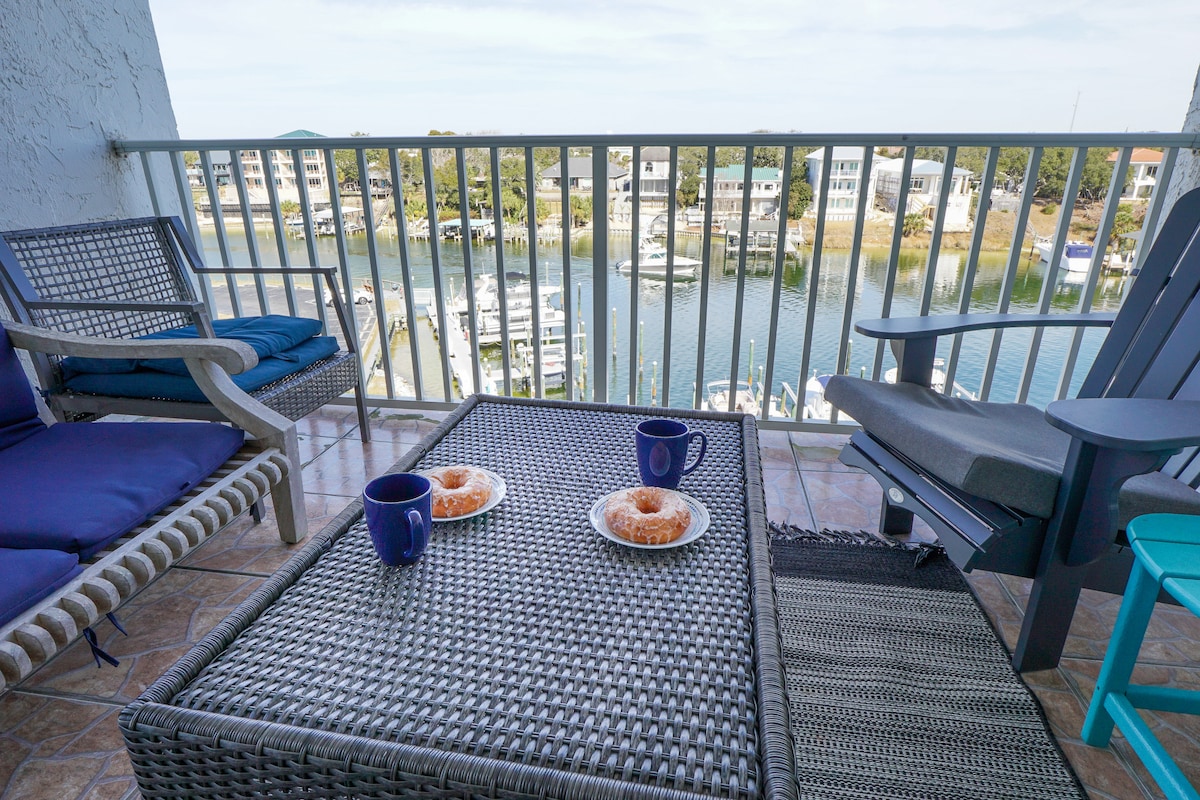 Welcome to The Salty Pirate, your waterfront vacation paradise! Kick back & relax in our calm, stylish condo featuring a king size bed, luxury bathroom & kitchenette. Relax in bed, enjoy the boats cruise by or watch the 65 inch TV. The waterfront balcony entices you to read & relax. Enjoy the resort style pool or reserve the 2-seater kayak (when available) provided for you to explore the waterway. Downtown restaurants & bars are walking distance & the white sugar sand beaches are 2 miles away!