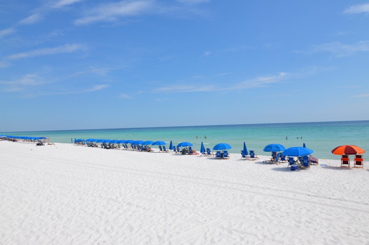 Sugar Sand Crystal Beach Escape: Just across the street from two entrances to "Sugar Sand" Crystal Beach and featuring a large private balcony with stunning water views in two directions. King master with TV, hallway bunkbed cubby, and a queen gel foam sleeper. Enjoy 2 FREE parking spaces, a heated pool, and hot tub. In-unit washer/dryer. 2 Roku flat-screen TVs. Fully stocked kitchen with Keurig, coffee maker, and tea kettle. *Must be 25+ unless active duty military.
