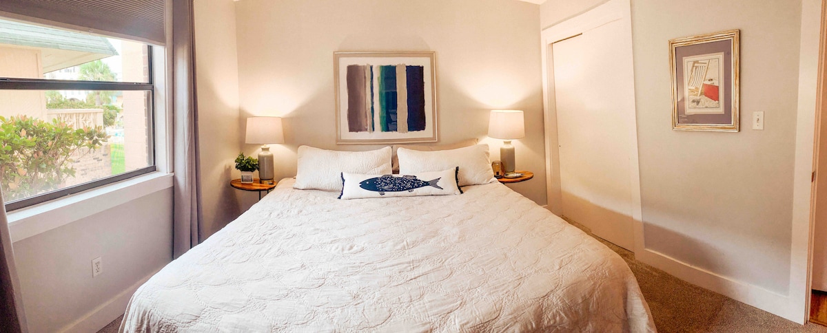 Cozy oasis with a view that takes your breath away! You'll enjoy relaxing on the private balcony overlooking the ocean. King bed and twin pullout loveseat. Beautifully renovated kitchen and bath. Fully stocked kitchenette with granite countertops. The full sized refrigerator is a special perk in this Luxury Honeymoon suite. Charming coastal accents throughout. Special attention has been given to this unit to ensure everything is top notch with professional upgrades. Waves roll in, cares roll out