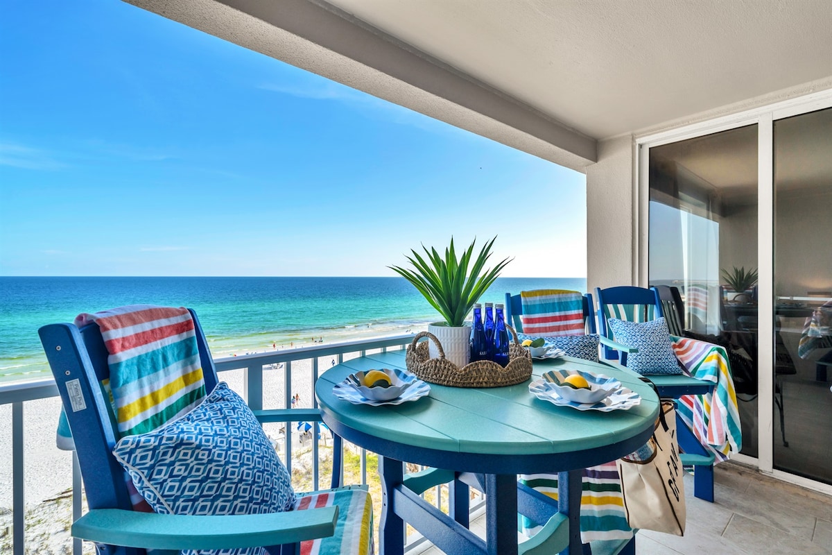 -Full beachfront view on the 4th floor with a balcony -2Bdr/2Bath: 1 king size, 2 twin size, 1 pull-out sofa-sleeps 6. 2 full bathrooms -Fully equipped kitchen -Free Wi-fi,Smart TV -Beach service (seasonal) -Outdoor swimming pool -Communal jacuzzi -Fresh linens,towels,essentials -Washer/Dryer -Grilling area -Communal workout room -Close to dining and shopping/peer -2 free parking spots -Close to Gulfarium -Close to Destin/Crab Island *By booking you agree to Short Term Property Rental Agreement