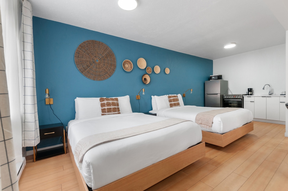 Our two queen bed suite is fully renovated with modern interior decor, and includes a kitchen, dining room for 4. The room has a small outdoor seating area, with a view of the lake - perfect for a morning coffee or evening beverage. There room has easy access to our beautifully landscaped outdoor gathering area. Our two queen bed suite can accommodate four adults, or two adults and two children. Please note there is no seating area, beyond the dining table chairs and beds, in this room.