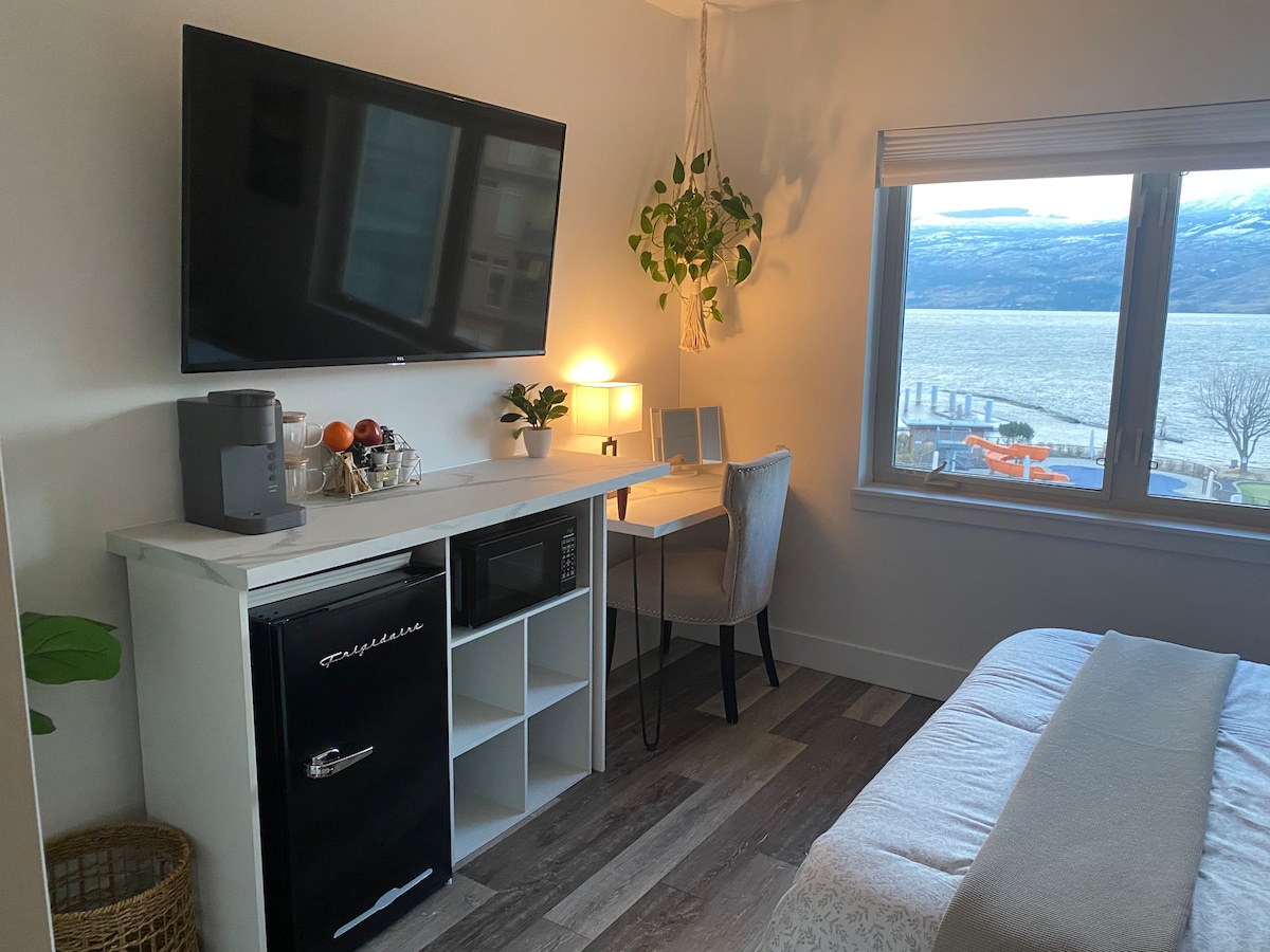 Best lakefront location right outside your front door. This unit is a lakefront studio that has a Queen bed with a 3 piece bathroom, kitchenette with all the basics including coffee maker, microwave and toaster. Wifi and cable TV included plus on site laundry and an outdoor heated seasonal pool open from May 18 to October 10th. We have staff on site during business hours 7 days a week to exchange fresh towels and linens for you. We are 100% Non Smoking indoors and out.