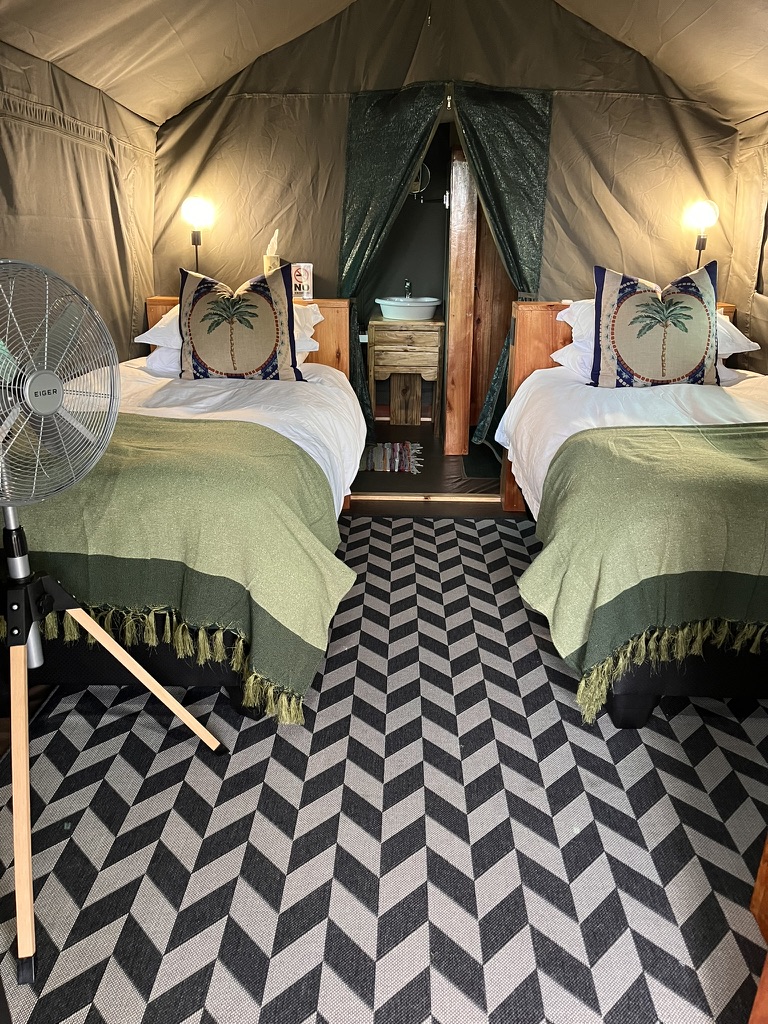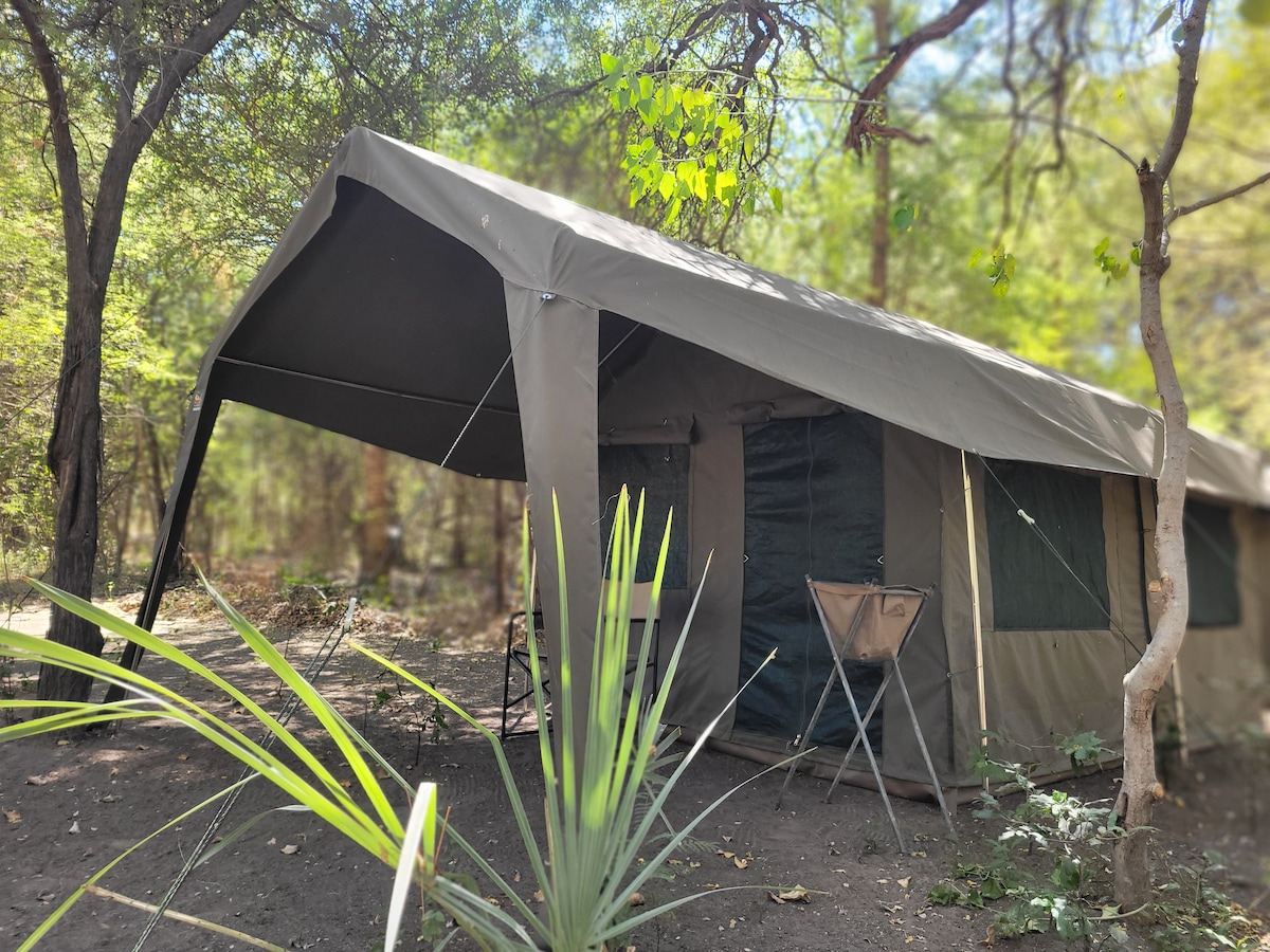 Reconnect with nature at this unforgettable escape. Glamping under the Jackalberry tree, alongside the Boro river, north of Maun, on the edge of the Okavango Delta. The river gracefully passes by our unique Bar & Restaurant. Dine at our pizzeria, relax at the bar, soak in our pool, tan in the sun, breathe in the African bush while watching the wildlife on a guided river trip. Bathroom facilities are communal. Hand washing of laundry is available on request. Wi-fi is available at the bar.