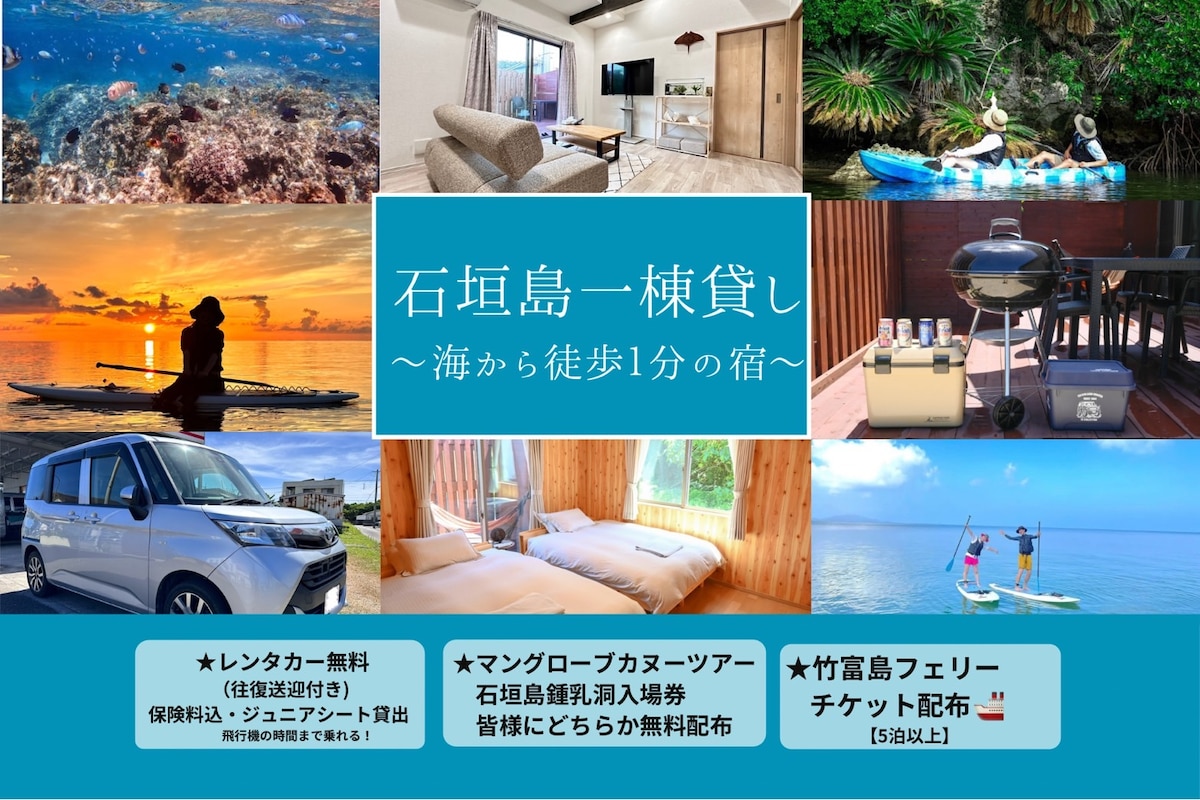 Located in the northern part of Ishigaki Island, the villa is surrounded by the ocean, mountains, and mangroves. The private beach is only 1 minute walk away, and you can enjoy the quiet ocean without crowds. 1: Free rental car (with round-trip airport pick-up)⭐︎The car is a passenger car. 2: Half-price SUP or kayak activity experience 3: Free rental of snorkel and life jacket 4: BBQ equipment rental available (3,000 yen per person)