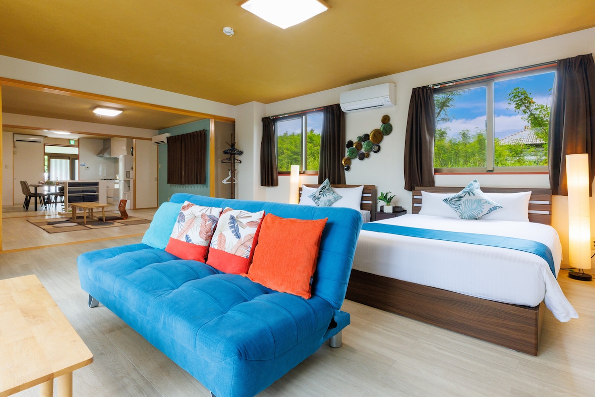 D冲浪胜地!冲绳3卧室7人温馨海景别墅丨丨独立厨房尽享烹饪乐趣丨驱车6分钟可达海边丨家庭出游