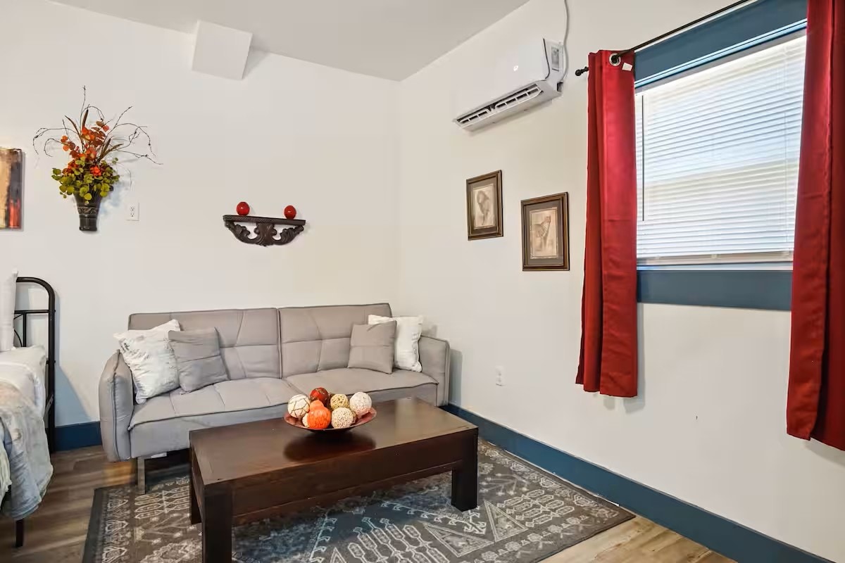 The Traveler’s Nook in OKC is a cozy and cute guest suite conveniently located in the NW of the city. The suite is newly built. It has a private entrance, a charming patio, stylish bathroom, a comfortable Queen size bed, a convertible sofa bed, mini fridge, Smart TV with all the main streaming apps, and a coffee station with coffee maker and microwave. Dishes, mugs, silverware, and glasses are provided!