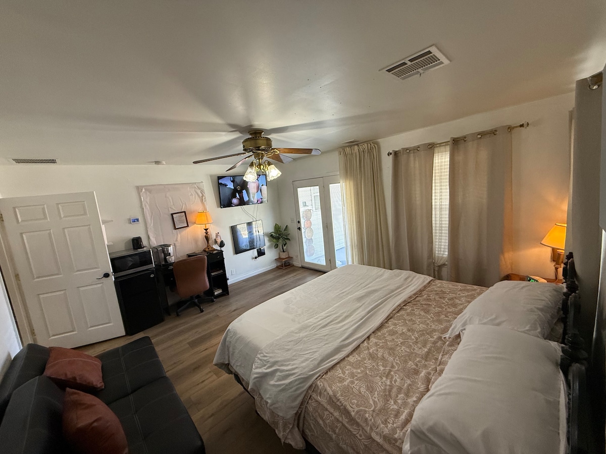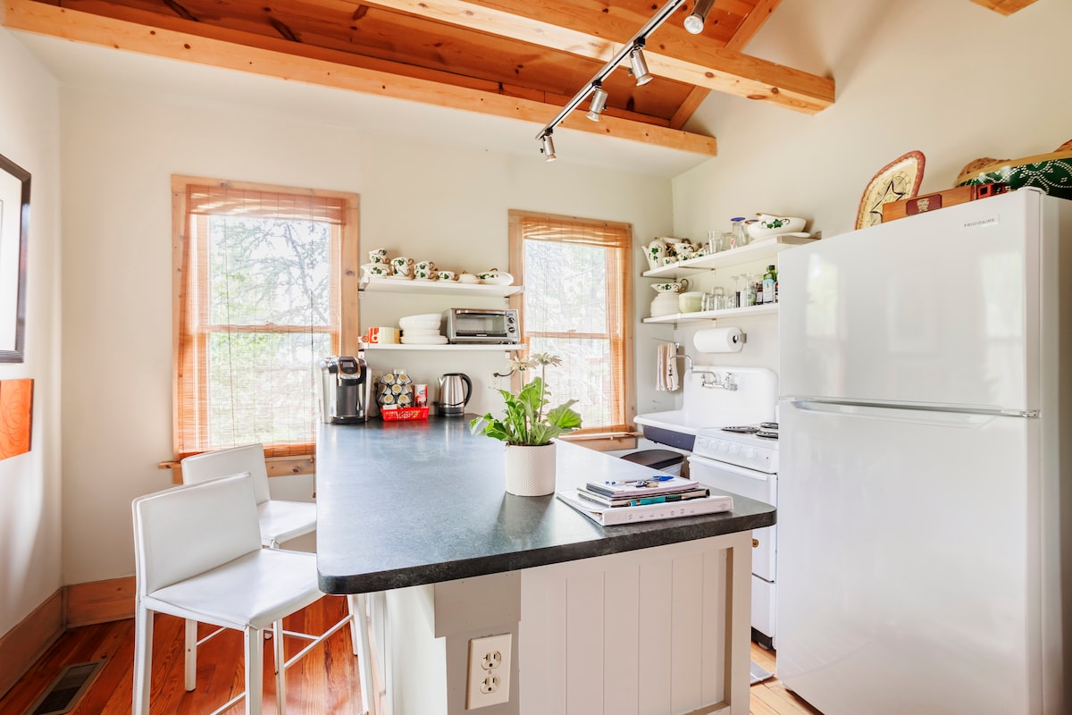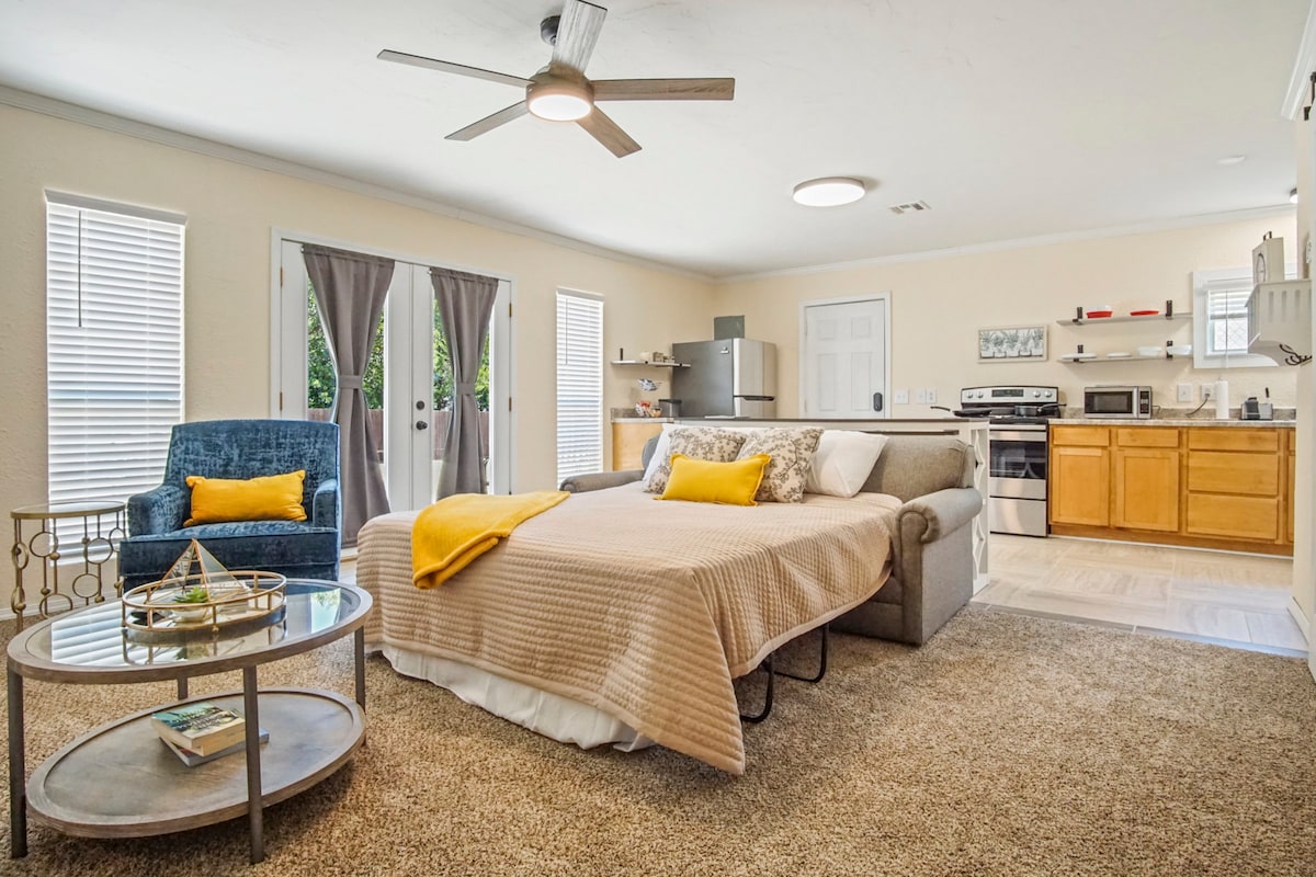 Come enjoy our backyard guesthouse, centrally located to enjoy all of OKC's best local spots! This one bedroom studio (250 sq feet) has been thoughtfully designed to think of all that you may need for a restful stay - coffee, snacks, comfy bedding, & more! This guesthouse is tucked away behind our house offering added safety. We occupy the main home & backyard. We have a friendly Great Dane (Winston) that is well mannered & is monitored while outside. Access to the home is via a driveway.