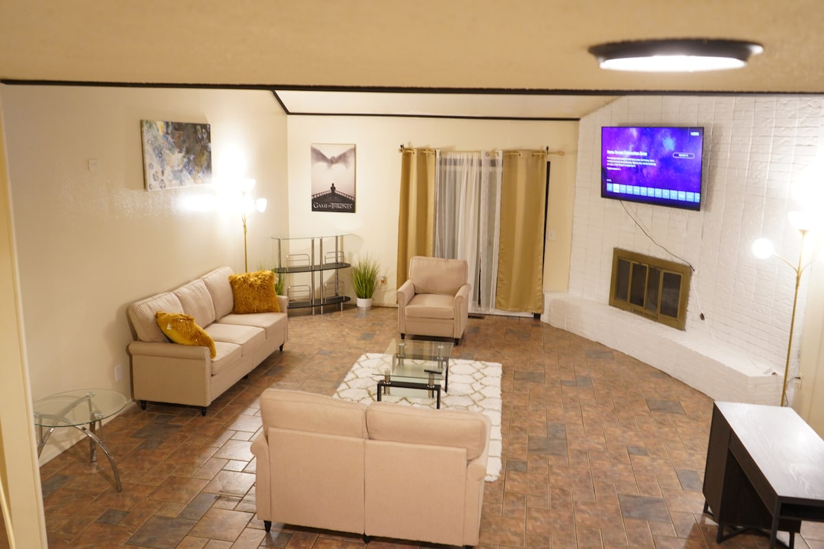 HomeChoice-Your newly remodeled peaceful private safe getaway home. Come enjoy a hidden gem of a spacious one level home with easy access to biking trails, nature parks, and major attractions. Easy access to freeways and highways allows you to travel to any Oklahoma City destination in minutes. Enjoy the excitement of a huge game room and a put put golf course to practice your endgame. Disinfectants, UV-C Lamps and Air Sanitizers are utilized. No animals allowed due to extreme allergies.