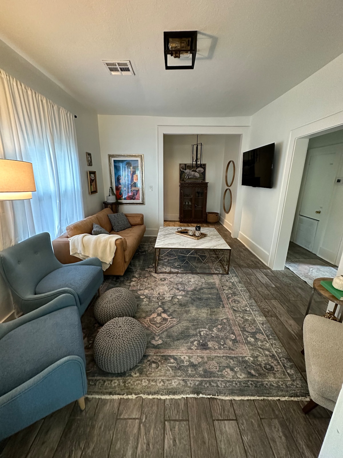 THIS IS A DUPLEX. Very quiet 3 bed 2 full bath offers unique private front courtyard, and back outdoor living room with TV & grill. Modern interior filled with art. Open living/dining/kitchen. Primary bedroom suite features KING size bed, 55” Smart TV, and spacious bathroom with walk-in shower. Secondary bedroom features KING size bed and TV. Perfect location minutes to restaurants and shopping. Out of town guests only. Easy access to all major interstates. Pets allowed ($40 per stay. )