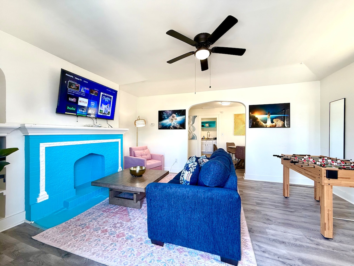 Spacious historic home in the heart of OKC! Enjoy all-wood floors, a fully stocked kitchen, a large dining table, and a cozy couch for relaxing. Perfect for gatherings with a bar, fire pit, and a large backyard. Walk to restaurants, bars, and coffee shops, and just minutes from the Fairgrounds, concert venues, and sports arenas. Designed for families, friends, and events alike—comfort, charm, and convenience all in one place.