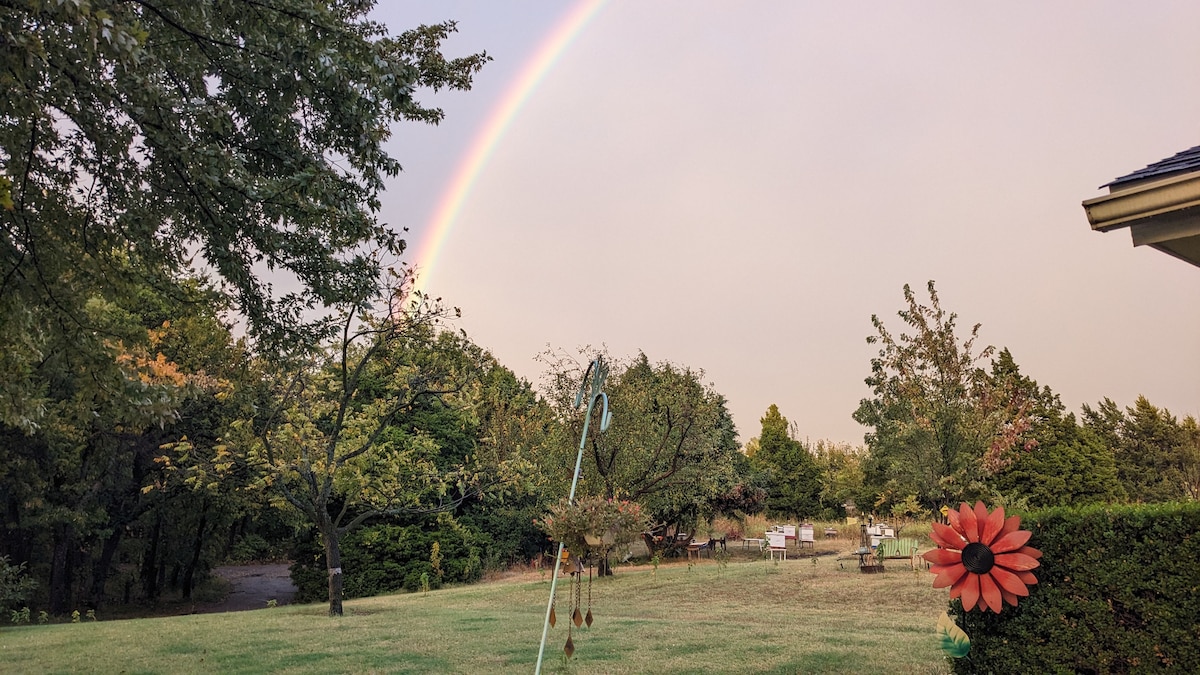 Low single occupancy rate, $10/guest thereafter. Tucked away on 5 serene acres in central Edmond, Hidden Hollow Honey Farm offers 540sq ft of safe, quiet lodging w/in walking distance of Edmond restaurants & activities. Close to Mitch Park/Golf/Route 66/OCU & UCO/Soccer/Tennis. 2nd bedroom is a small bunkhouse for kids - see pics. WIFI, 2 big Smart TV’s w/antennas, King bed, toys/books/games, rustic cottage kitchen w/coffees/teas/snacks, patios w/firepits/swings, pond/apiary views, & wildlife.