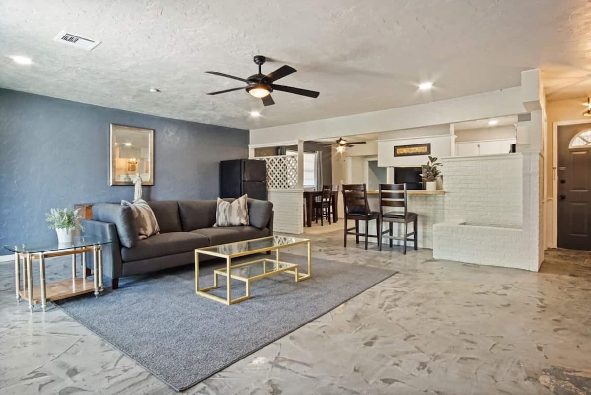 Designed with natural textures, earthy tones, & great natural light to ensure a cozy, calm vibe you won’t want to leave! Dbl master suite w/ 2 queen bds & 2 ensuite private baths makes this perfect for 2 couples, families, professionals, or anyone looking to stay in the heart of OKC and still get a local experience. PLAZA is OKC's best arts districts & only a 3 block walk to delicious food, world class street art, coffee, local shops, festivals, live music, & more. Downtown OKC is 5 min drive!