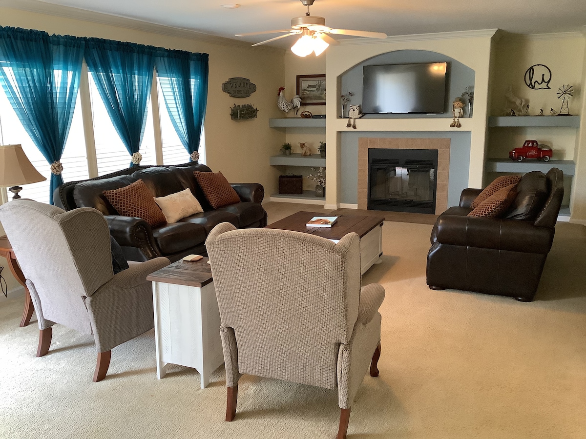 Family & Group-Friendly Escape-5BR lodge on 9 secluded, park like acres w/ pool, hot tub, fireplaces, gourmet kitchen, & dining & sleeping for 22. 4 king beds, billiards, darts, games, & more. Walk to trails, drive 5 min to Medicine Park and Old Fort Sill. Great for reunions, nature lovers, & family fun. Pets welcome w/ fee. Prices based on # of guests. > 30 people venue fees apply. Events of 30-50 $250, 50-75 $500, 75 to 125 $1,000 rent up to 80 chairs ($2.75 ea) & 8 tables ($10 ea)