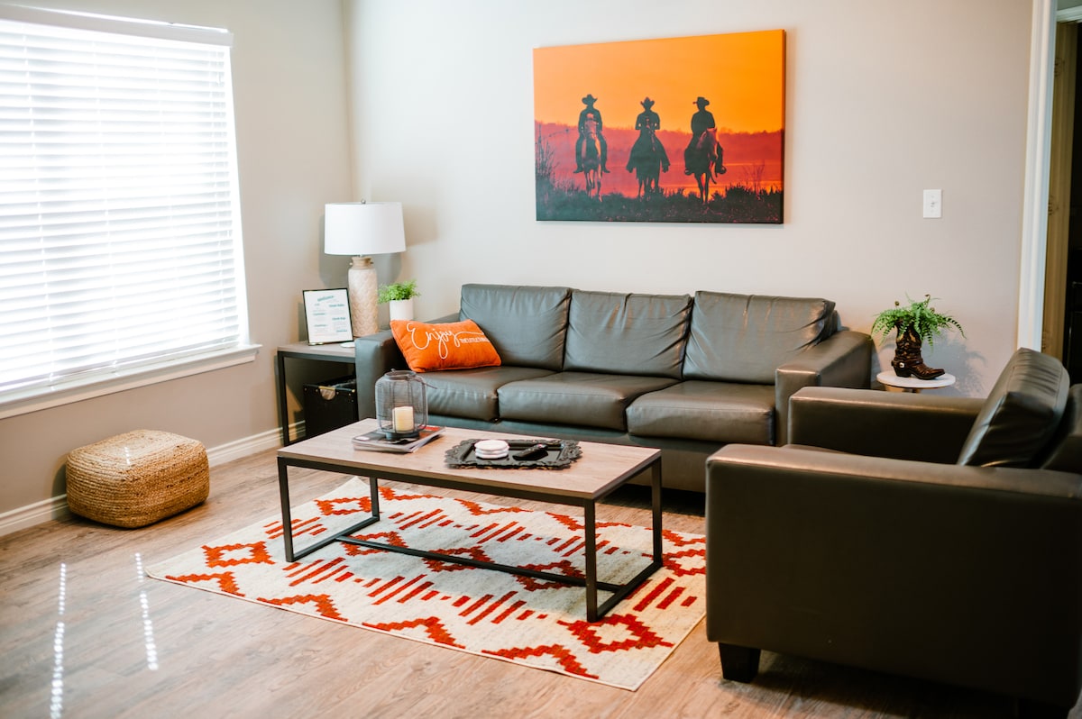 Enjoy a luxury reservation at this centrally-located, beautifully designed studio condo! This recently remodeled condo has high-end finishes with great quality in mind. Everything from the dimming overhead lights to the marble finishes, it was designed with you in mind. Guests will love our outdoor patio area with seating. They will also enjoy our endless amenities like fast WiFi, pool, fire pit, patio, grill, and more! We are located just MINUTES from the heart of downtown OKC.