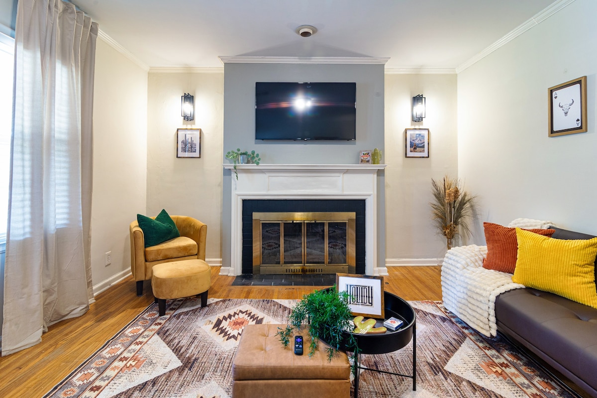 A few houses from Midtown’s pickle ball courts, you’ll find the Ivy Cottage. Charm and character are the highlight of this adorable property. The oversized sectional is the perfect place to cozy up and watch your favorite show on the Smart TV. Or serve dinner in the dining room with French doors that open to the patio. In the back you’ll find a hot tub, smart TV, couch, dart board, wine fridge, cornhole, etc. Plush beds await when you’re ready to call it a night. *Fireplace is not working.