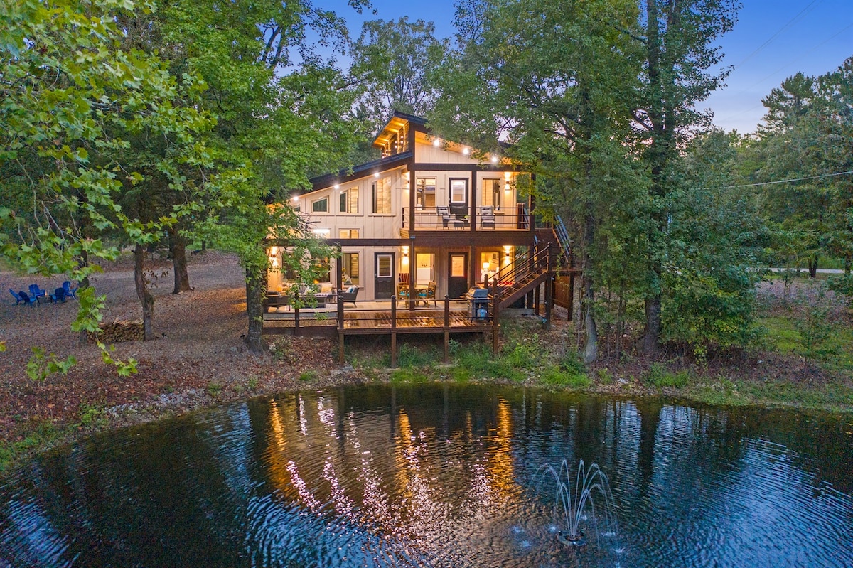 Escape to Whispering Pond Retreat, a modern luxury cabin for 9. Nestled in a tranquil, wooded setting, this waterfront escape offers a mostly private hot tub, dual decks overlooking a fish stocked pond with fountain, and an outdoor fireplace. Perfect for families and groups, you're just minutes from Hochatown's shops and the adventures of Broken Bow Lake. Enjoy high-end comfort and serene nature in one unforgettable getaway.