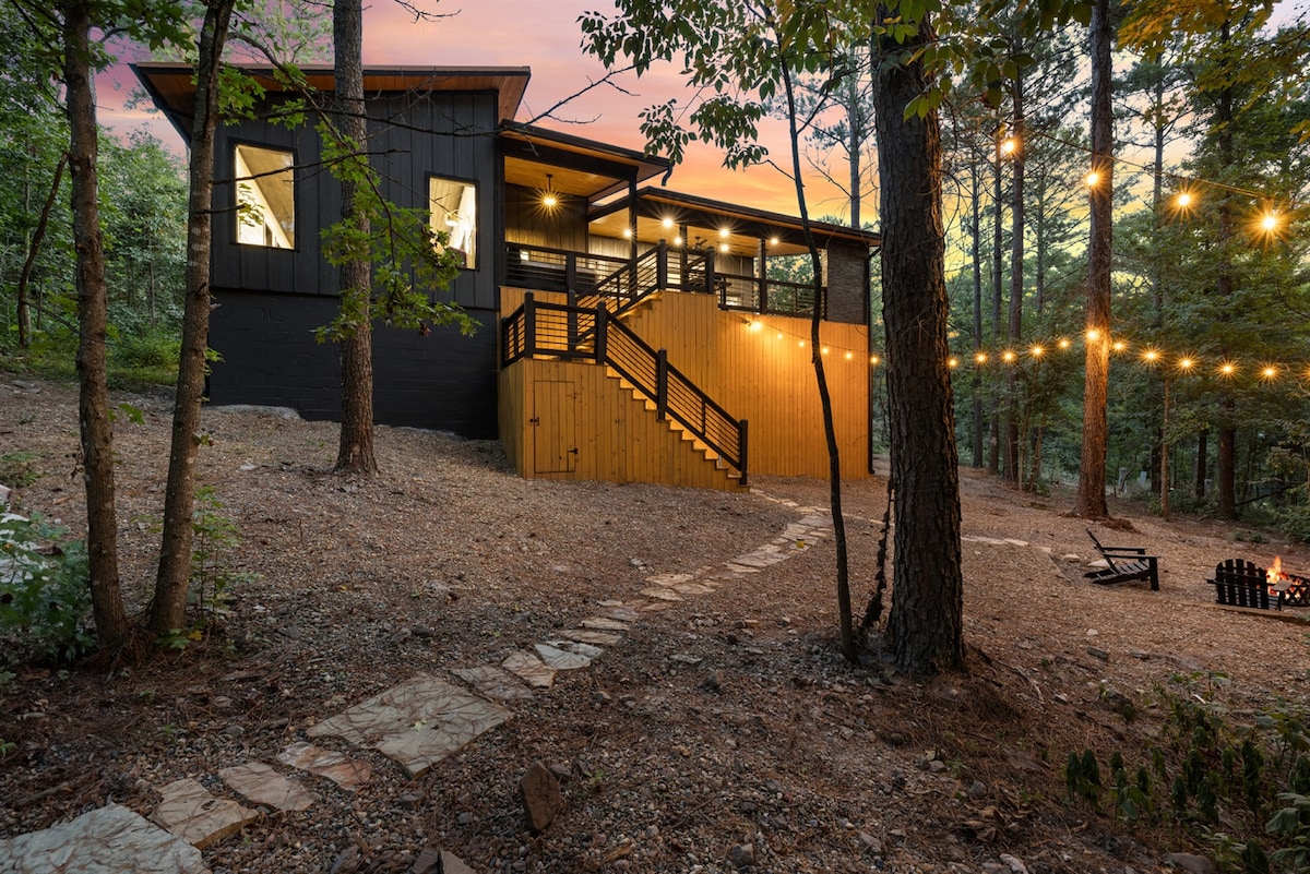 You’ll love this mountain cabin for your trip to Broken Bow! Here's why: - 5 min to downtown Hochatown - Hot Tub w/Towels - Fire Pit & string lights - Private balcony with mtn and sunset views - 1400 sq ft of patio space - Upstairs 1 King w/balcony + Bunk Room - Downstairs 1 King Bed - Arcade - Huge Outdoor couch space - TV in all rooms - Fast WiFi - Outdoor & Indoor Fireplace - Fully Equipped Kitchen - Rope climbing wall - Corn hole+Horse Shoes We'd love to host you! Book with us Today!