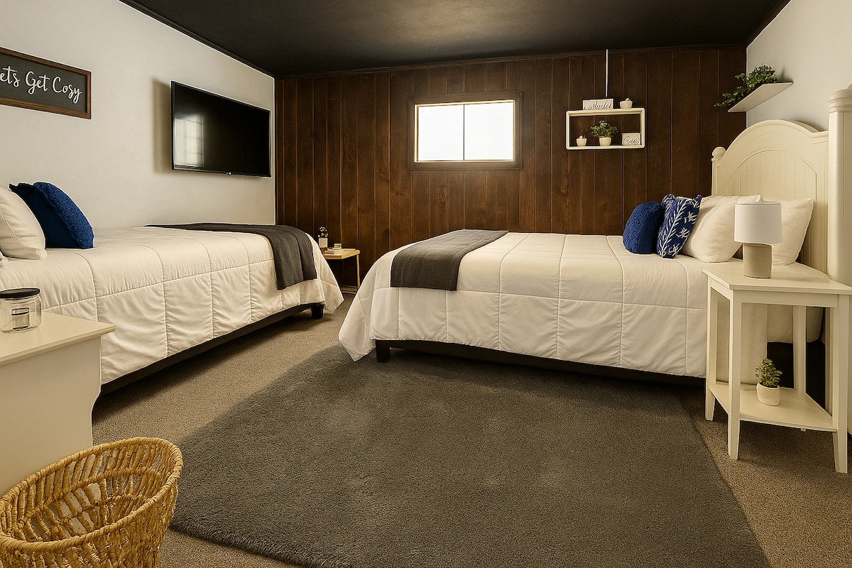 Low single occupancy rate, $10/guest thereafter. Tucked away on 5 serene acres in central Edmond, Hidden Hollow Honey Farm offers 540sq ft of safe, quiet lodging w/in walking distance of Edmond restaurants & activities. Close to Mitch Park/Golf/Route 66/OCU & UCO/Soccer/Tennis. 2nd bedroom is a small bunkhouse for kids - see pics. WIFI, 2 big Smart TV’s w/antennas, King bed, toys/books/games, rustic cottage kitchen w/coffees/teas/snacks, patios w/firepits/swings, pond/apiary views, & wildlife.