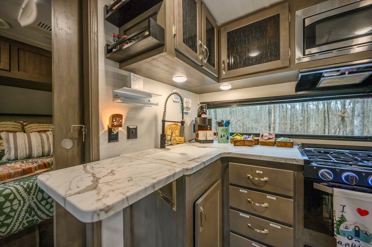 Escape to nature in our cozy Cherokee Grey Wolf camper! Perfect for couples or solo adventurers, this stylish retreat features a comfy bed, kitchenette, full bathroom, and heat/AC. Nestled in our privately owned RV Park with outdoor seating, fire pit, and stargazing views. Whether you're exploring trails or just unwinding, this camper has everything you need for a relaxing, off-grid-style stay—with all the comforts of home.