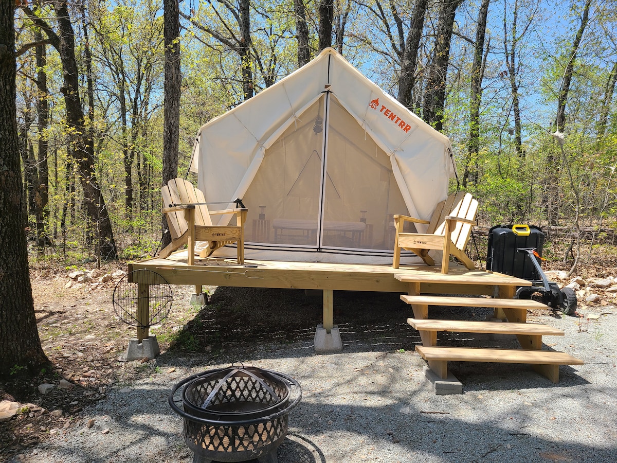 ** Pets Stays Free - Max 2** Our unique luxury tent in Broken Bow, OK has just been upgraded! Full bath with clawfoot tub, hot water, two HVAC units, a new tin roof and kitchenette with microwave, toaster oven, hot plates and mini-fridge. Includes wifi! Minutes from Beavers Bend Park where you can swim, hike and horseback ride. After a full day of fun, unwind on the front porch with a glass of wine and watch the sun go down. Cook out, stargaze, and let nature lull you to sleep.