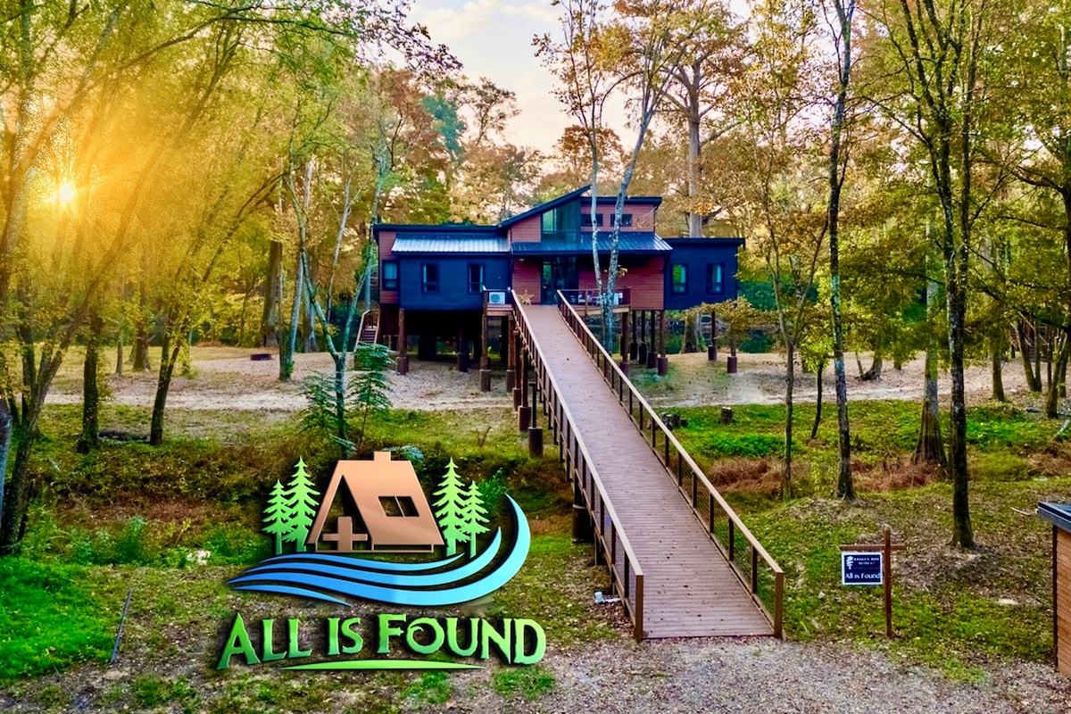 When Bora-Bora meets Treehouse Masters, you have "All is Found"! This Brand New River Cabin, right ON the Mountain Fork River in Broken Bow OK, was completed in December 2023! From fishing to kayaking, from hiking to exploring, from the infrared sauna to the hot tub, from star gazing to spa like bathrooms, from campfires to the memories that will be made... you might find yourself getting a little lost... but this truly unique cabin reveals where All is Found!