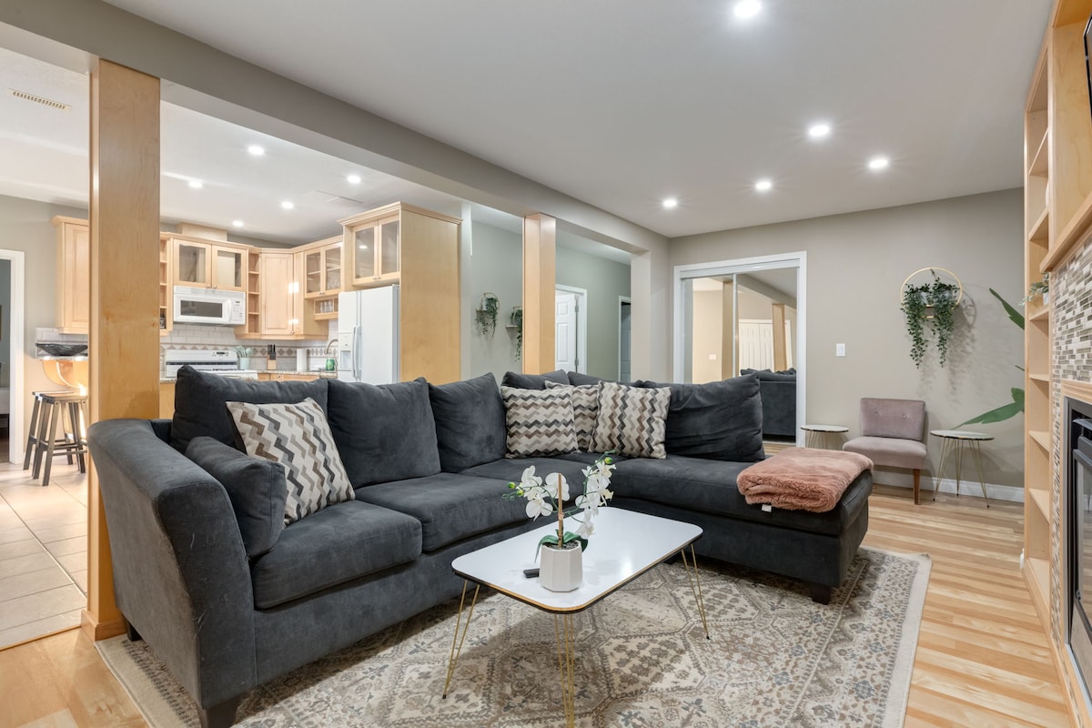 Come and stay in our luxury two bedroom, 1 bathroom lower level retreat. You will be instantly greeted with a cozy living area and stylish decor. Cozy up to a modern crystal fireplace and a comfortable large reclining leather sectional, while you enjoy watching a 80” smart theater TV. We offer a side bar with coffee station, microwave and fridge and freezer. There are 2 large bedrooms and walk-in closet with plenty of storage. The king size tempur pedic bed is absolutely heavenly.