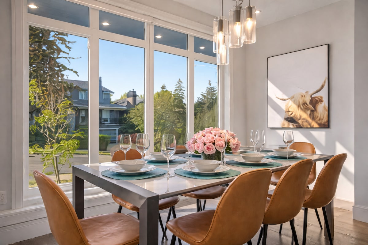 Elegant 2BR Walkout Basement is a private, meticulously curated retreat offering refined comfort and quiet luxury.Enjoy warm evenings by the fireplace and abundant natural light from large windows.This spacious two-bedroom suite features a queen and a double bed ideal for guests who value privacy,cleanliness and an elevated standard of comfort. Direct backyard access and dedicated driveway parking are included.Steps from the Bow River pathways, Sobeys,Seton YMCA and South Health Campus Hospital.