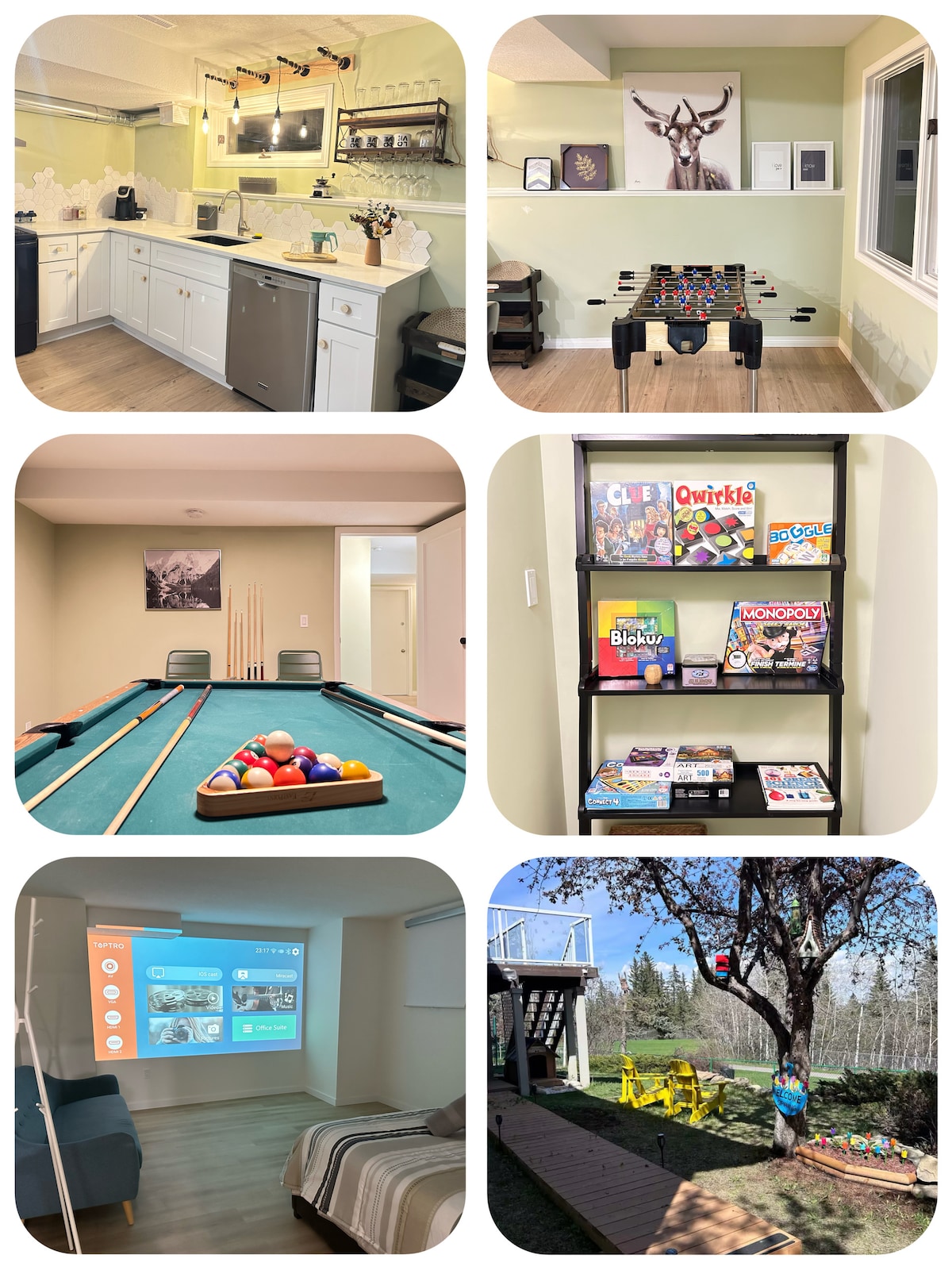 About the Blue Bungalow Enjoy your stay at 'The Blue Bungalow'. A 4 bed, 2 full bath tastefully renovated and decorated home in Southwest Calgary. It is fun, bright, and sleeps 8 comfortably, we have board games, foosball, arcade games, a chalk wall, two 55" TVs, A/C, a gas BBQ, and plenty of parking & a garage. It’s Nicely furnished, in a great location with plenty to do for everyone, see our list's below of highlights of our home & things near by. Perfect for your next Calgary stay