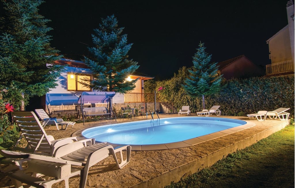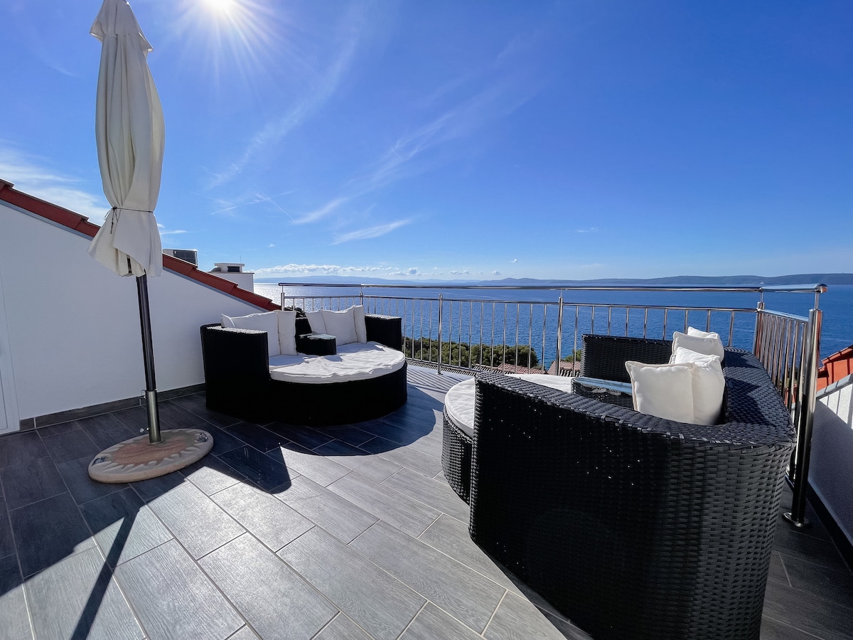 Modern apartment with panoramic views. The apartment is well equipped and has everything you need for a relaxing holiday. It is located on the island of Čiovo, near Trogir, just 10 km from Split Airport. The apartment has 3 bedrooms for 6 people, 2 bathrooms plus an extra toilet, and an open-plan living room/kitchen with access to a terrace with a dining area. There is also a large rooftop terrace with lounge furniture and fantastic views. In addition, there is a lovely pool and sun loungers.
