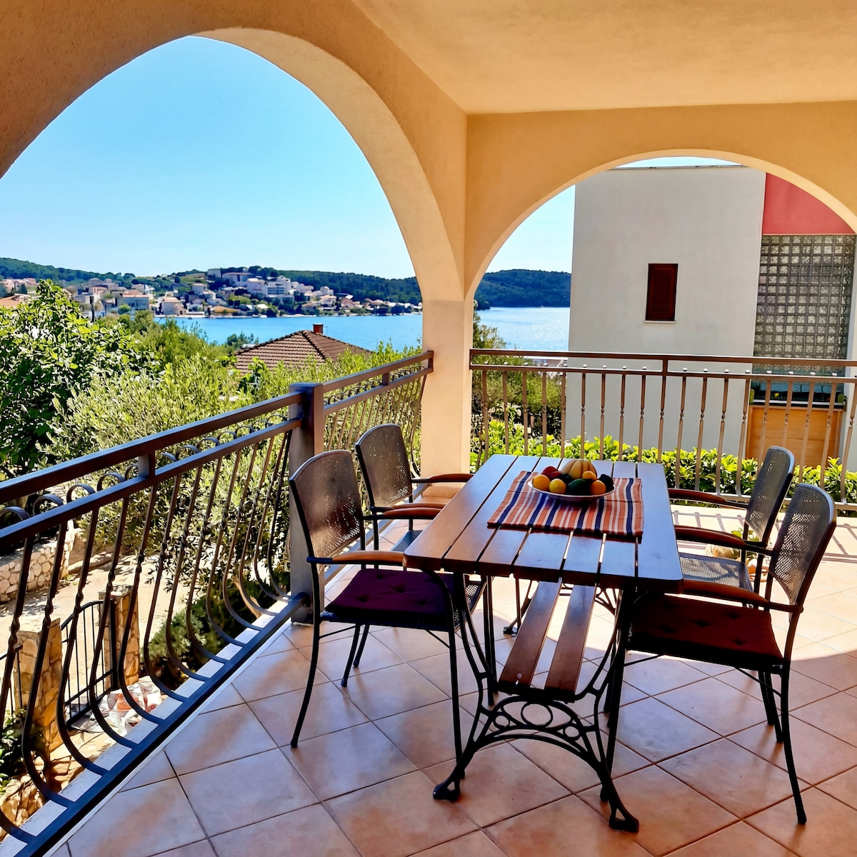 Ovaj prekrasni apartman se nalazi u mirnom okruženju na otoku Čiovu. Blizu svih sadržaja i blizu mnogobrojnih plaža. Ima veliku i komfornu terasu koja vaš ljetni boravak čini nezaboravnim jer će vam poslužiti kao drugi veliki vanjski dnevni boravak. Stan ima 2 sobe, kuhinju sa dnevnim boravkom i blagovaonicom, wc i veliku terasu sa koje možete uživati u pogledu na more. Dnevni boravak i obe sobe imaju klima uređaje