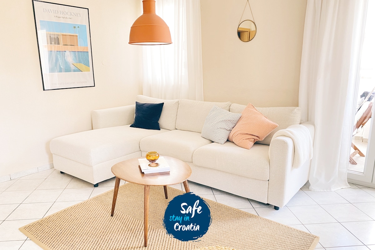 Slow living apartment is a new, 50 m2 large, 4 star apartment. It has mediterranean vibe and design. You can relax on our beautiful terrace with stunning sea views. Apartment is perfectly located, 50 meters from the most beautiful city beach Znjan. In 3 minutes, you are on the beach. By uber it takes 10 minutes to the old town. Also you can rent a bike nearby.