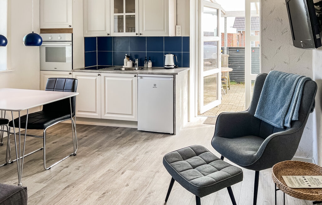 (VE281) Bright renovated pool house for 10 people, located in a pocket on a dead end road. The summer house is located on a 2310 m2 natural plot with approx. 1200 meters from the beach. The plot is bordered by the forest and cycle path towards Filsø and Henne Strand. Behind the house there is a large meadow where wildlife often comes by. The house contains: Entrance/hallway with wardrobe that is in open connection with the living room.