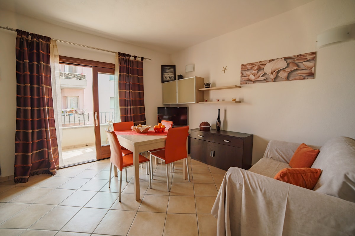 Olbia città', grazioso appartamento per l'estate. Ampio soggiorno con angolo cottura attrezzato, camera da letto matrimoniale, nella zona giorno ulteriore spazio con altro letto matrimoniale, TV, WiFi, stanza bagno con con doccia e lavatrice, terrazzino esterno, climatizzatore, fornito di biancheria . regione Sardegna codice IUN : Q6911