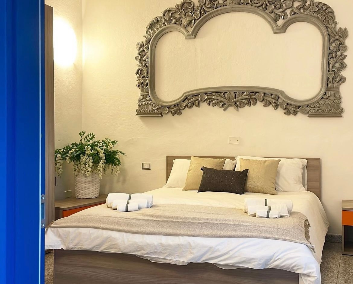 The Italia room is located on the second floor (no elevator) is large spacious with a double bed and two single beds. Suitable for families, it accommodates up to 4 people. It has a private bathroom, but it is not located inside the room, in fact you have to cross the common room to access it. It has a small balcony overlooking Via XX Settembre, one of the main pedestrian streets on the island. Independent air conditioning (hot/cold) and 40" LCD TV.