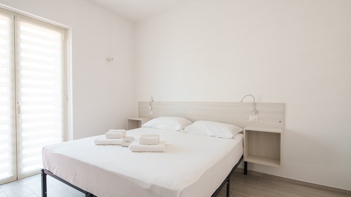 SUPERIOR ROOM The double room is located on the third floor of a very recently built structure on Olbia's new waterfront, just a short walk from the center. Everything from the furnishings to the facilities is taken care of in detail in order to make a minimalist room the best of luxury vacation experiences. The room has a small terrace overlooking the waterfront with views of the island of Tavolara and the Gulf of Olbia and is equipped with a private bathroom with shower with fine finishes.