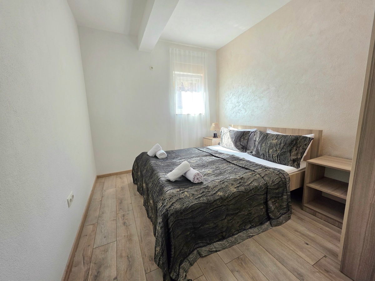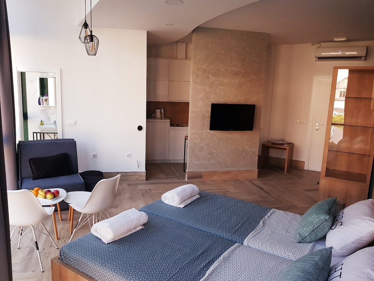 Enjoy a stylish experience at this centrally-located place in brand new building.The apartment consists of a bright bedroom with a comfy king-sized bed, dinning table for 4 persons and modern fully equipped kitchen. A sunlit living room with Smart TV. The pull-out corner in the living room can also serve as an additional bed for 2 more guests. The entire apartment was designed by architect (Adil Glavovic - axisarchiteture)