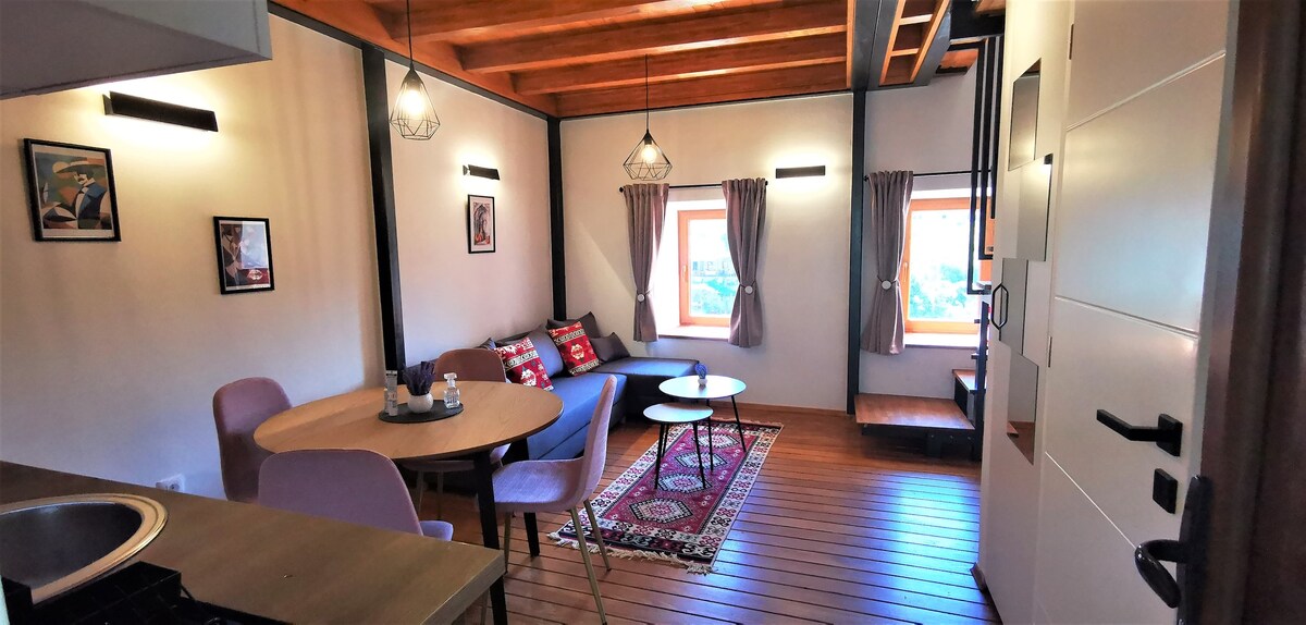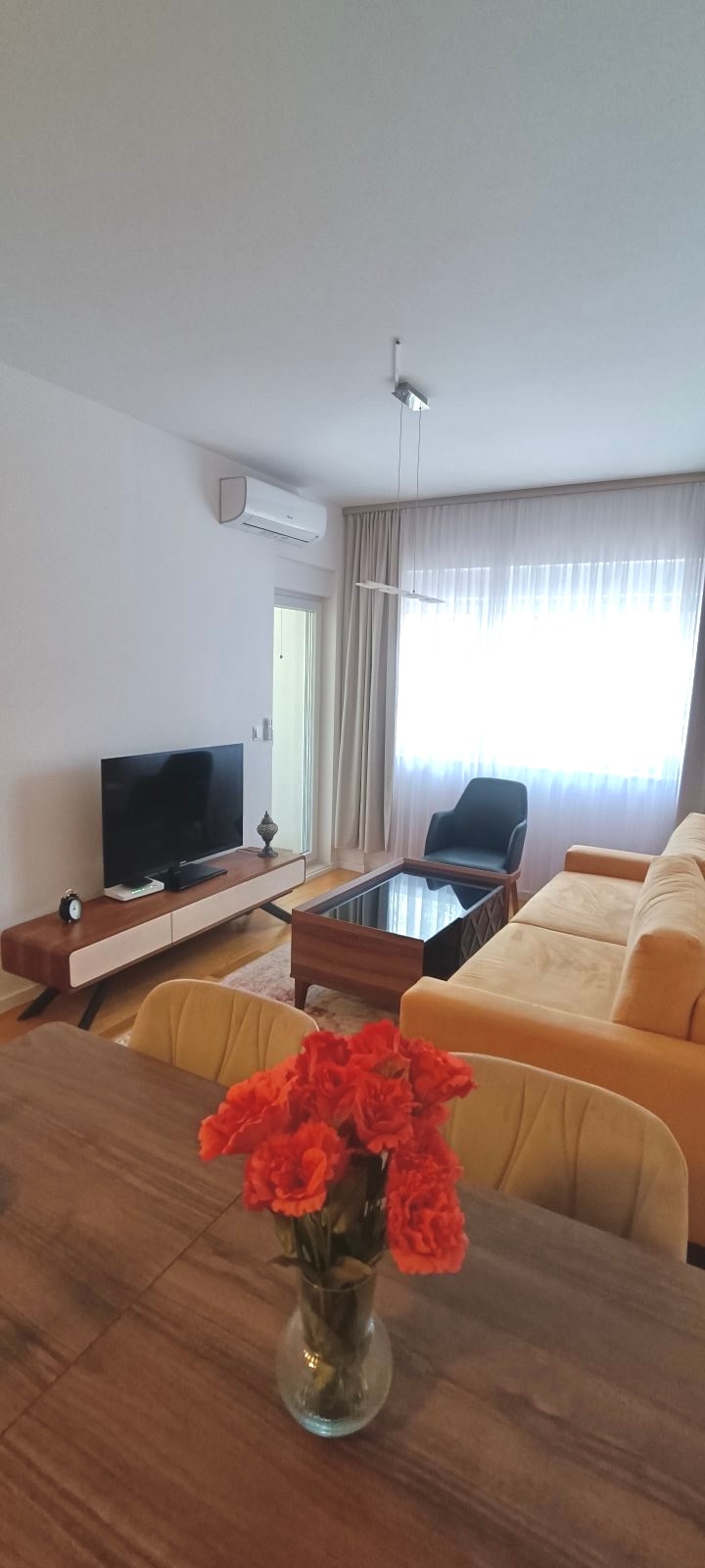 Enjoy a stylish experience at this centrally-located place in brand new building.The apartment consists of a bright bedroom with a comfy king-sized bed, dinning table for 4 persons and modern fully equipped kitchen. A sunlit living room with Smart TV. The pull-out corner in the living room can also serve as an additional bed for 2 more guests. The entire apartment was designed by architect (Adil Glavovic - axisarchiteture)