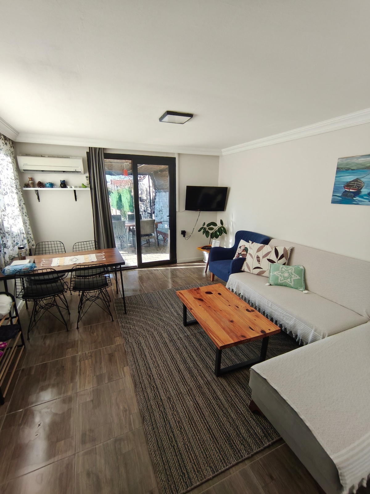 Tamamen size ait bir avlu ve kendi banyolarına ve tuvaletlerine sahip iki yatak odalı ev. Hem merkezde yaşamanın rahatlığı hem de kendi avlusu ile huzur ve sakinlik bir arada. Sanat sokağı ve Malgaca pazarına 75 metre , Bağ yolu ve denize araçla 15 dakika yakınlıktaki evimiz; sadelik içinde konfor arayan konuklarını bekliyor. Evde yatak odalarının kendi banyoları dışında bir banyo ve tuvalet daha mevcuttur. Banyolar oda içinde ve açık banyodur. Mutfağımız ayrıntılı malzemeler kapsar.