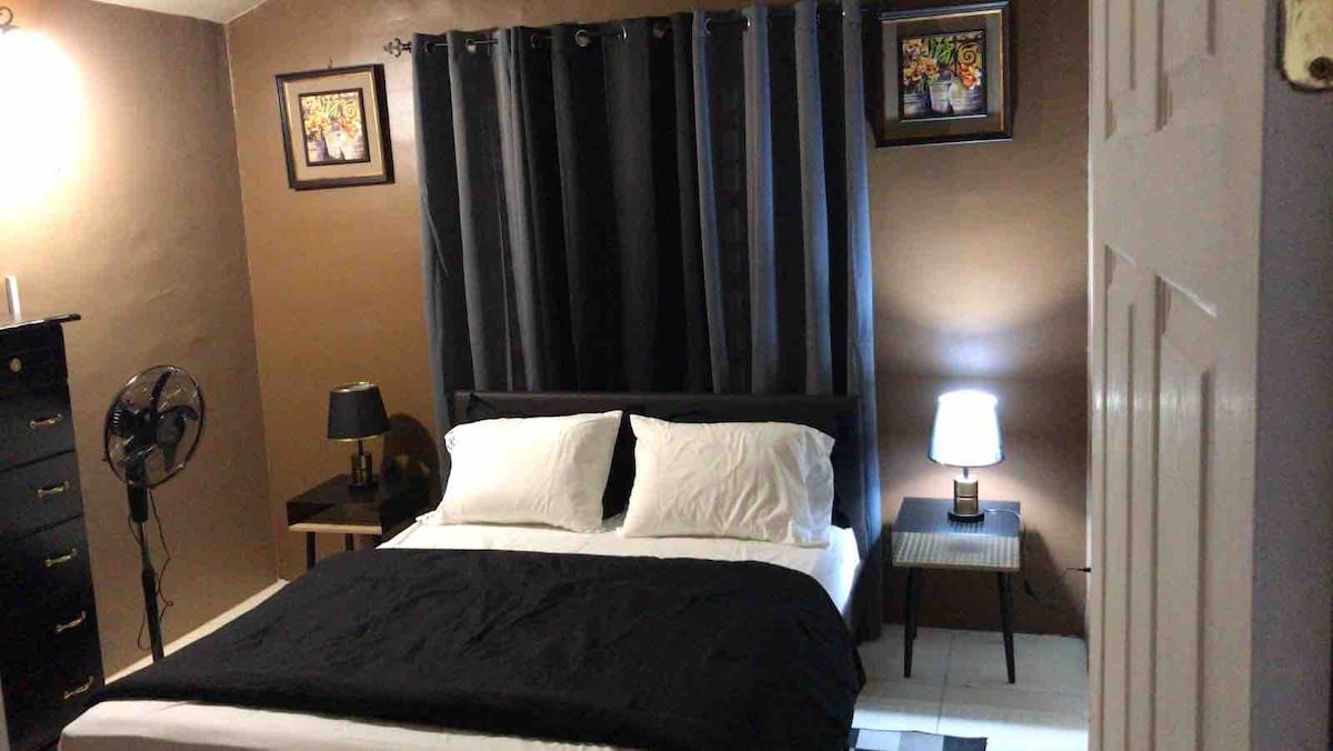 Modern Home Gated. 1 King size bed, 1Q-B, 2baths located in Old Harbour with GAZEBO and BAR. This amazing home also decked with LED Lighing, 1 fancy Kitchen an laundry. It's fully A/C and grilled with 24/7 security, Smart lock, Free NetFlix, also CCTV Cameras for your safety, a fire place. All furnitures are brand new to suit your needs. This is situated closed to the Town, Restaurant, Jerk Centre, KFC, Juici Beef, High 2000, 30mins portmore spanish Town 1 hour to Ocho Rios.