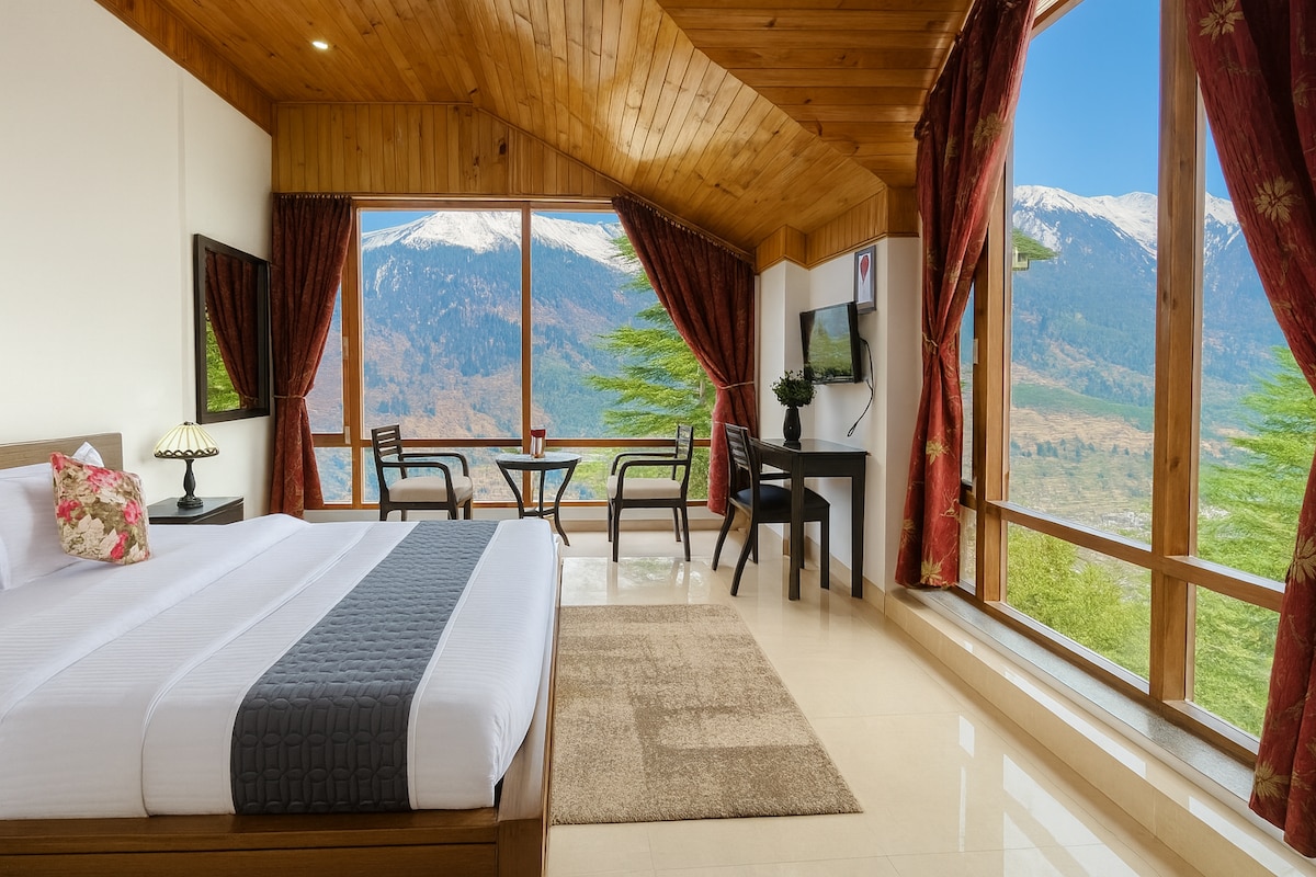 A newly built dedicated double deluxe room standing on the top of the mountain in Manali. It is a private place where only 2 - 3 houses are nearby this place not more than that. This place is unbelievably charming. From your room, you can see the entire valley and the glacier laden Himalayas of Kullu - Manali valley. This brand new double bedded room has attach kitchenette, hygienic washroom, study table, wi-fi and all basic amenities.