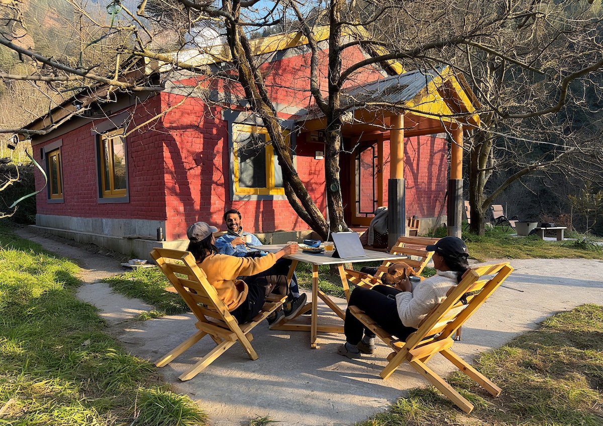 A house in the heart of the Himalayas, away from the hustle of the city. Enjoy a serene view of the valley surrounded by plum, apple, persimmon and other trees. A peaceful location which is perfect for a relaxing vacation or work-ation. Wake up to an amazing view of the mountains, enjoy a relaxing day reading a book in the balcony, or explore the many nearby sites and adventure activities; This location offers something for everyone.