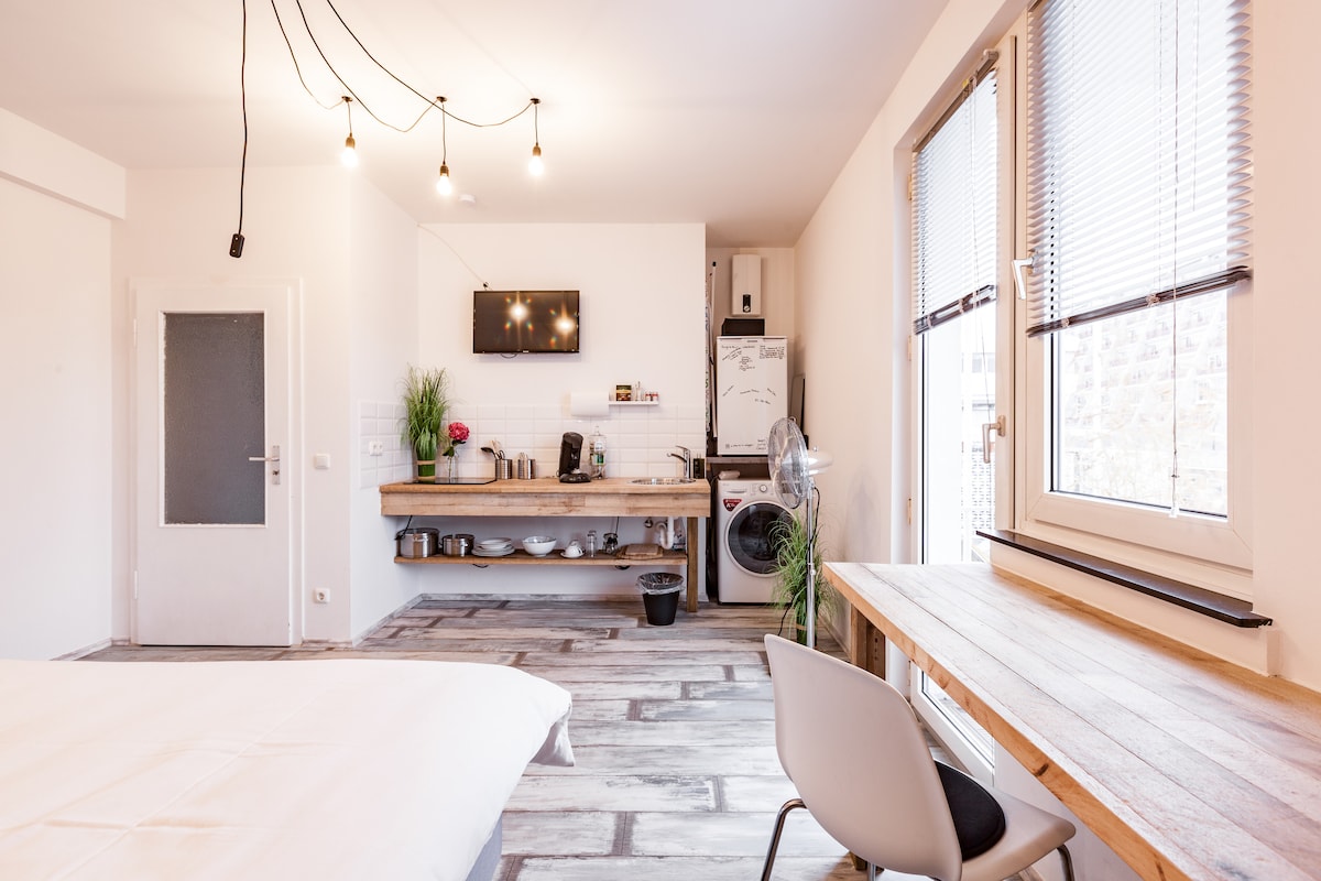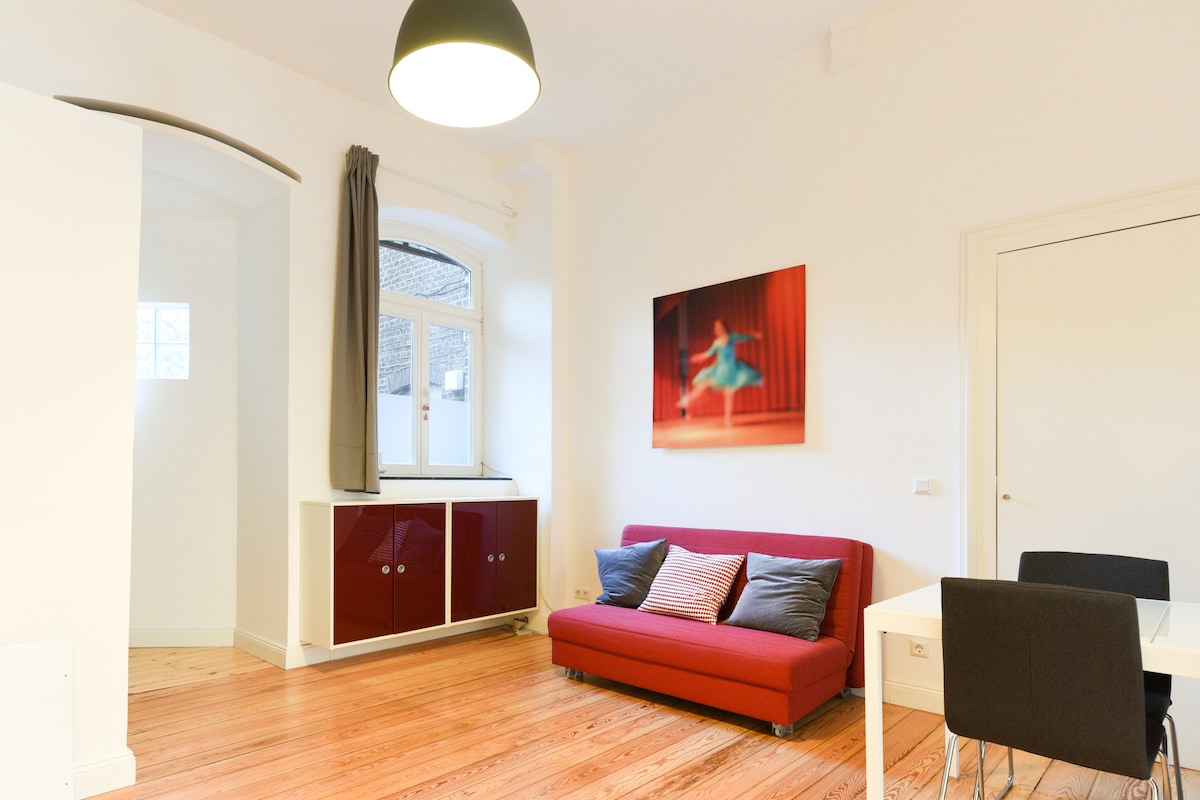Sunny, exclusive 1-room apartment in Cologne city center for 1-2 people; open floor plan, underfloor heating, comfortable bed (1.40 x 2m), stylish living area, kitchen, high-quality built-in furniture; modern bathroom design with daylight / exclusive furnishings; high-speed WiFi up to 100 mbit/sec; elaborate lighting design 3 min. to the shopping streets, restaurants and bars on the doorstep, 800 meters to the cathedral, freeway A57 by car in 5 min. Bookings of 90 days or more on request.
