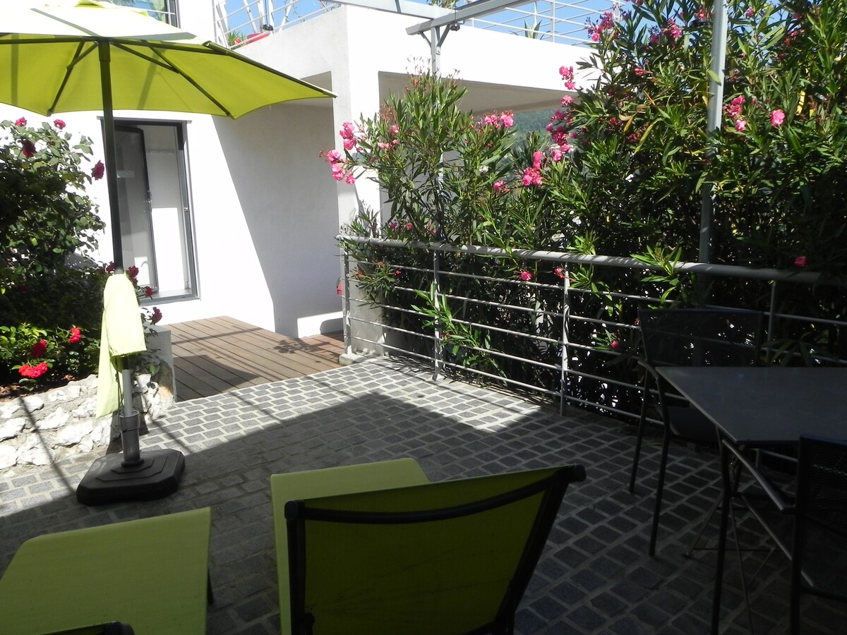T1 neuf de 37 m2 neuf dans un cadre idyllique en Rdc d'une villa familiale au pied des collines de Pagnol. Terrasse de 18 m2 pour vos petits déjeuners au pied du chêne. Piscine semi- privative ( Karin et Marc peuvent y accéder) accessible selon votre jouissance avec barrière de sécurité pour vos enfants sous votre responsabilité. Chambre de 13 m2 avec lit double. Coin Salon avec canapé lit double confortable ouvert sur cuisine équipée. ANIMAUX NON ACCEPTÉS