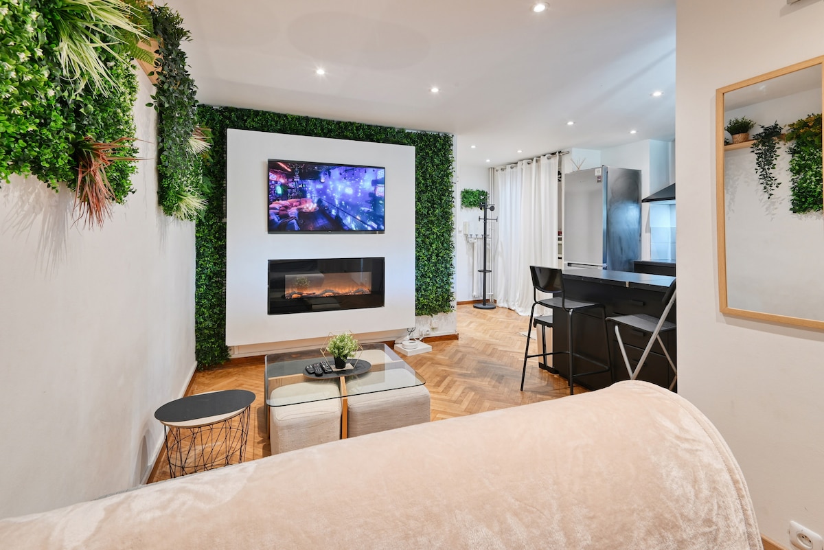 Completely renovated 65m² loft, offering a luxurious experience. The suite features a king-size bed (180x200) with ceiling mirror, a sumptuous bathroom with XXL walk-in shower and whirlpool bath, under a fiber-optic starry sky. The modern, fully-equipped kitchen opens onto a bright, spacious living room with XXL TV, home cinema and steam fireplace. This loft combines design, comfort and innovation, ideal for a romantic or professional stay in the heart of Marseille.
