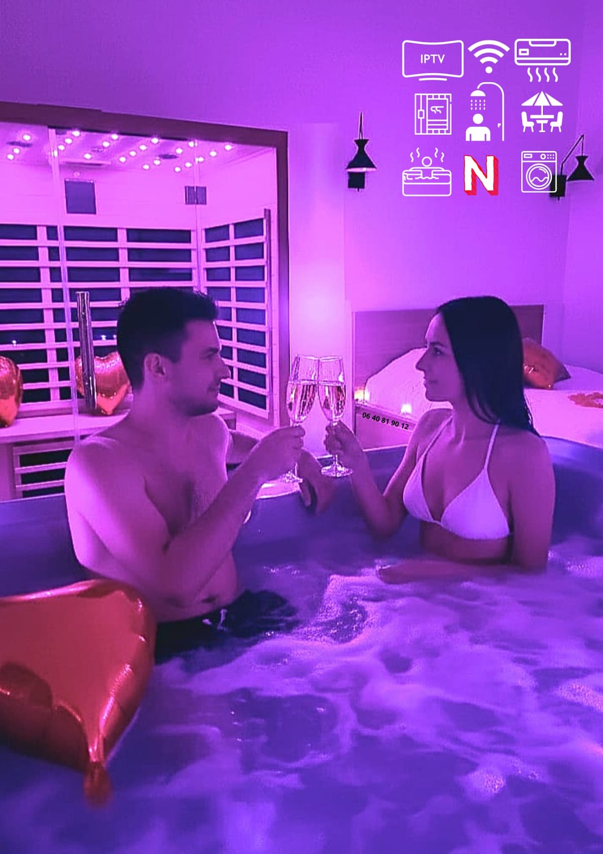 Située au coeur de la pinède, notre Suite Love&Spicy vous offrira un cadre unique pour profiter de vos instants en toute intimité, au calme absolu. Venez profiter de son jacuzzi professionnel ainsi que de son véritable sauna traditionnel, des peignoirs sont à votre disposition gratuitement. Retrouvez sa literie d'exception King size, avec linge de lit fourni ainsi que sa grande douche à l'italienne. Le petit déjeuner avec viennoiseries, jus de fruits, yaourt, confitures, fruits est inclus.