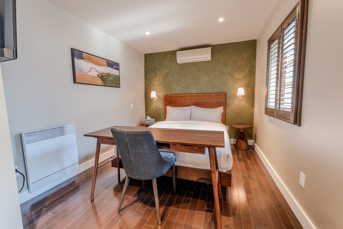 This elegant hotel room blends style and comfort, featuring a plush king bed with premium linens. Located in one of Montreal’s most vibrant neighborhoods, you’re steps from cafés, bars, and cultural gems. Guests also enjoy access to a welcoming lobby lounge and a spacious basement with cozy seating, a pool table, and big-screen TV—perfect for work or relaxation.