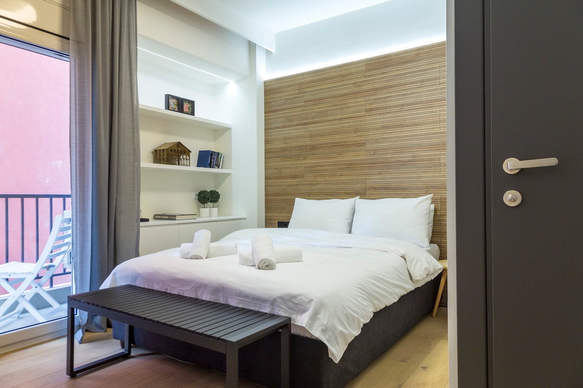 Unique 1 Bedroom fully equipped apartment on the seventh floor of a 2020 renovated building with a breathtaking terrace balcony. High speed internet, premium amenities, a luxurious queen size bed, and your very own Netflix account are but a few things we offer you. Luminous, spacious, with everything you might require to enjoy your stay in the heart of Thessaloniki's social life, only 5 minutes away from Aristotelous square and 2 minutes from the seafront. Welcome and enjoy your stay!