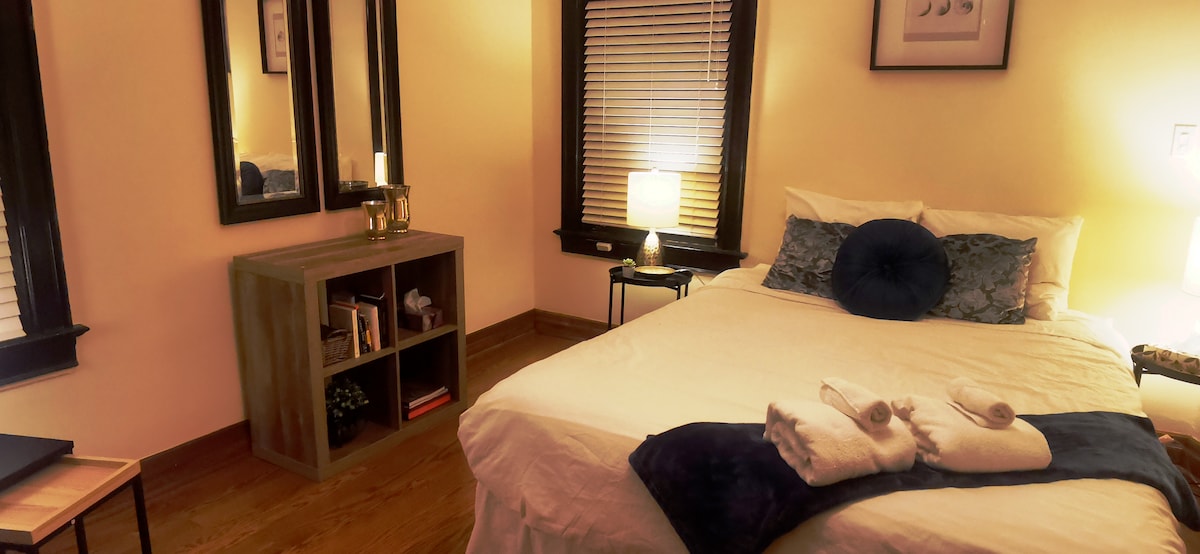 A whimsically decorated basement apartment with a separate entrance that welcomes all. The exposed brick gives it a unique character and the location means you're not too far from downtown, close to public transportation and away from congestion. Enjoy amenities such as a kitchenette with all the fixings for a continental breakfast, plentiful snacks and refreshments. The kitchen offers an induction cooktop & toaster oven instead of a stove. Guests can enjoy Netflix, Wifi, and free parking.