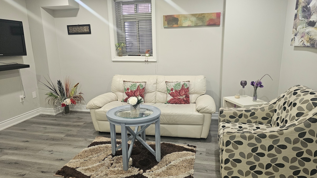 Welcome to our modern, cozy guest suite with your own private entrance - perfect for traveling couples or solo professionals looking for a quiet stay. We’re tucked away on a peaceful cul-de-sac, but still right in the middle of everything. Acoustically treated for a quiet, restful night’s sleep. HIGHLIGHTS • 15/20 mins to YYZ & 5 mins to Square 1 shopping. • 30 mins to Toronto & 1 HR to Niagara Falls. • Garden views from inside & outdoors. • 1 driveway parking spot.